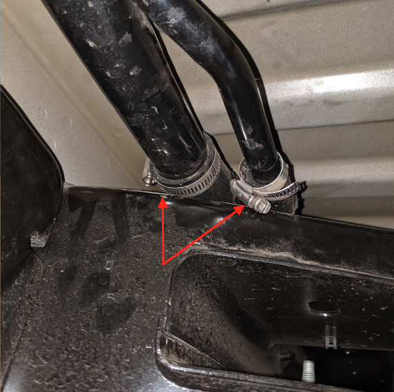 Remove the filler and vent hoses from the filler assembly. If the hose clamps are facing the bed, you can use a small 5/16” socket.
