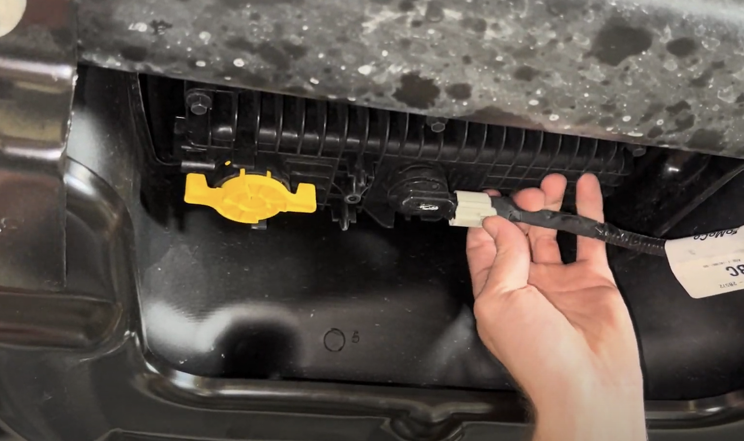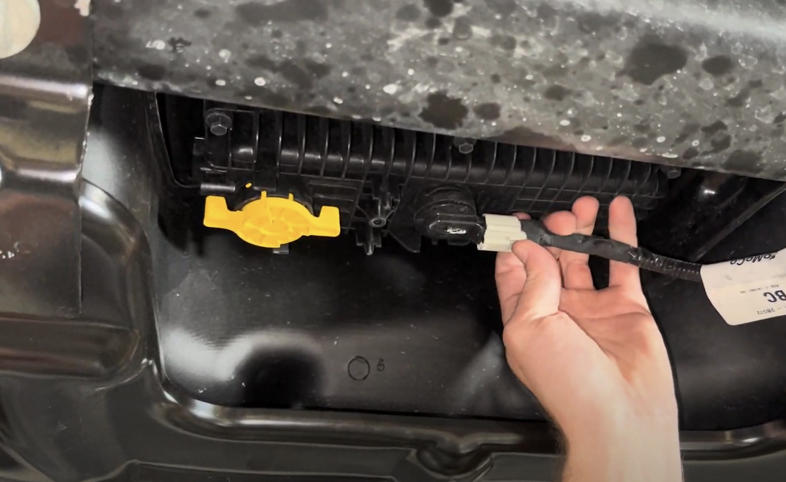 Reach over the frame rail to disconnect the electrical connection for the sending unit. Depress the tab and the connector will release.