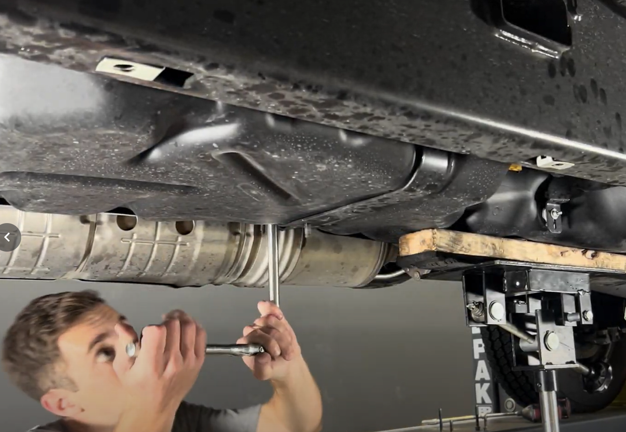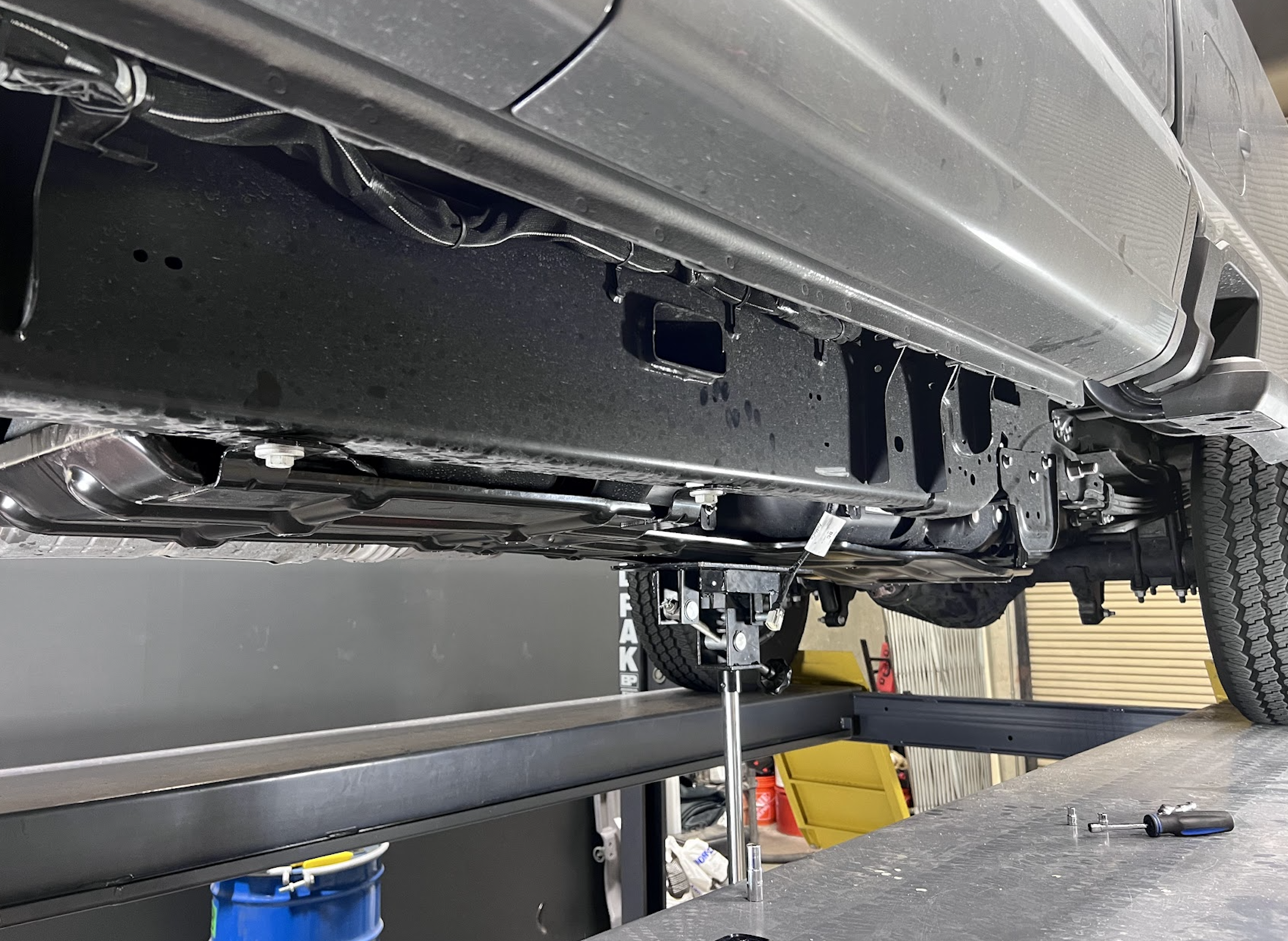 If your truck came equipped with a factory skid plate, now remove the skid plate. There are (2) 19mm head bolts (3) 13mm head bolts.