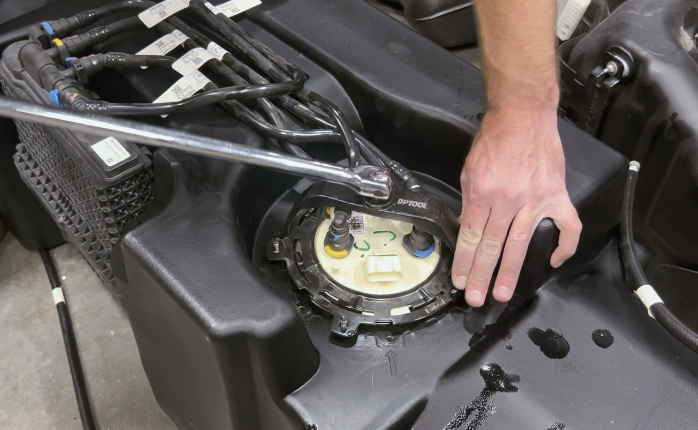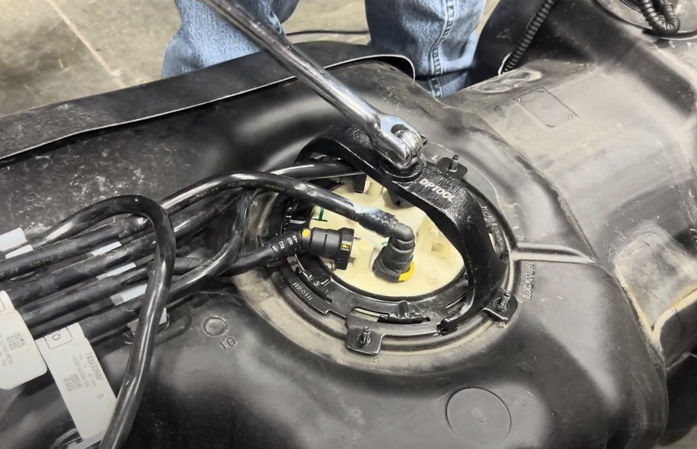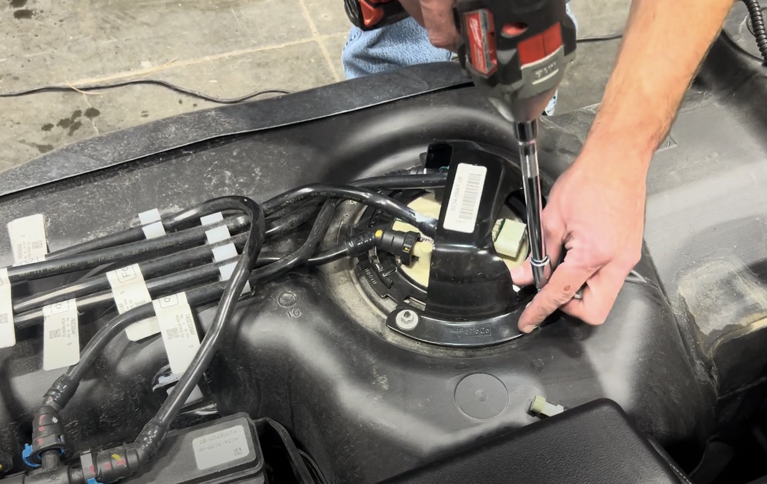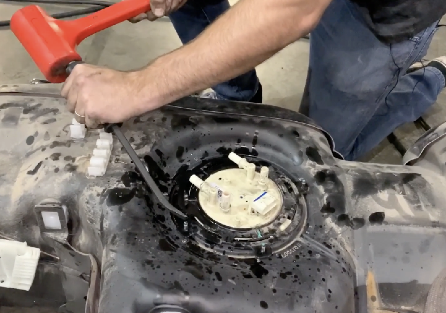 Make sure the locking ring is positioned the same way as it was on the OEM tank so the guard will still allow access to the electrical connector. Once confirmed, press down on the ring to get the ring started under the teeth on the ring.