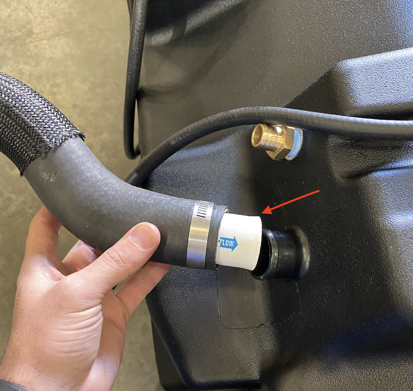 Transfer the filler and vent hose to the S&B Tank. Insert the check valve into the filler prior to installing the hose with the arrow facing into the S&B Tank.