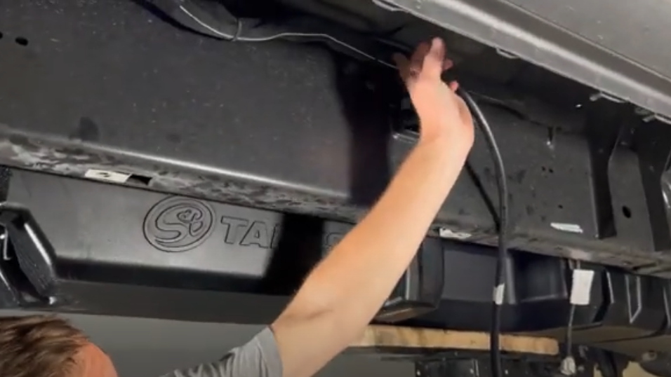 Now the tank is ready to be lifted into place. As your lift the tank into place, route the route breather hose over the crossmember, make sure the filler and vent go over the crossmember and make sure the ubolt falls into place in the front cutout.