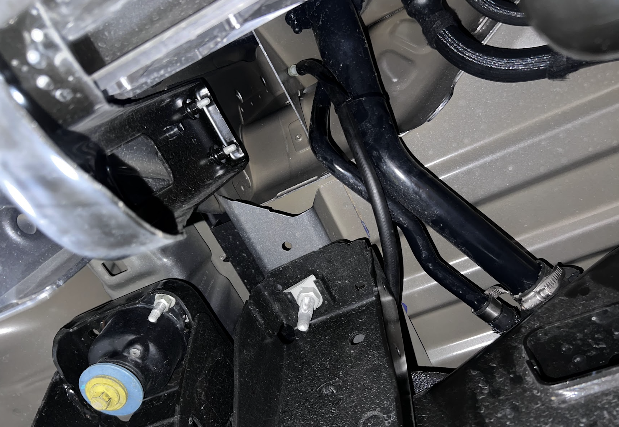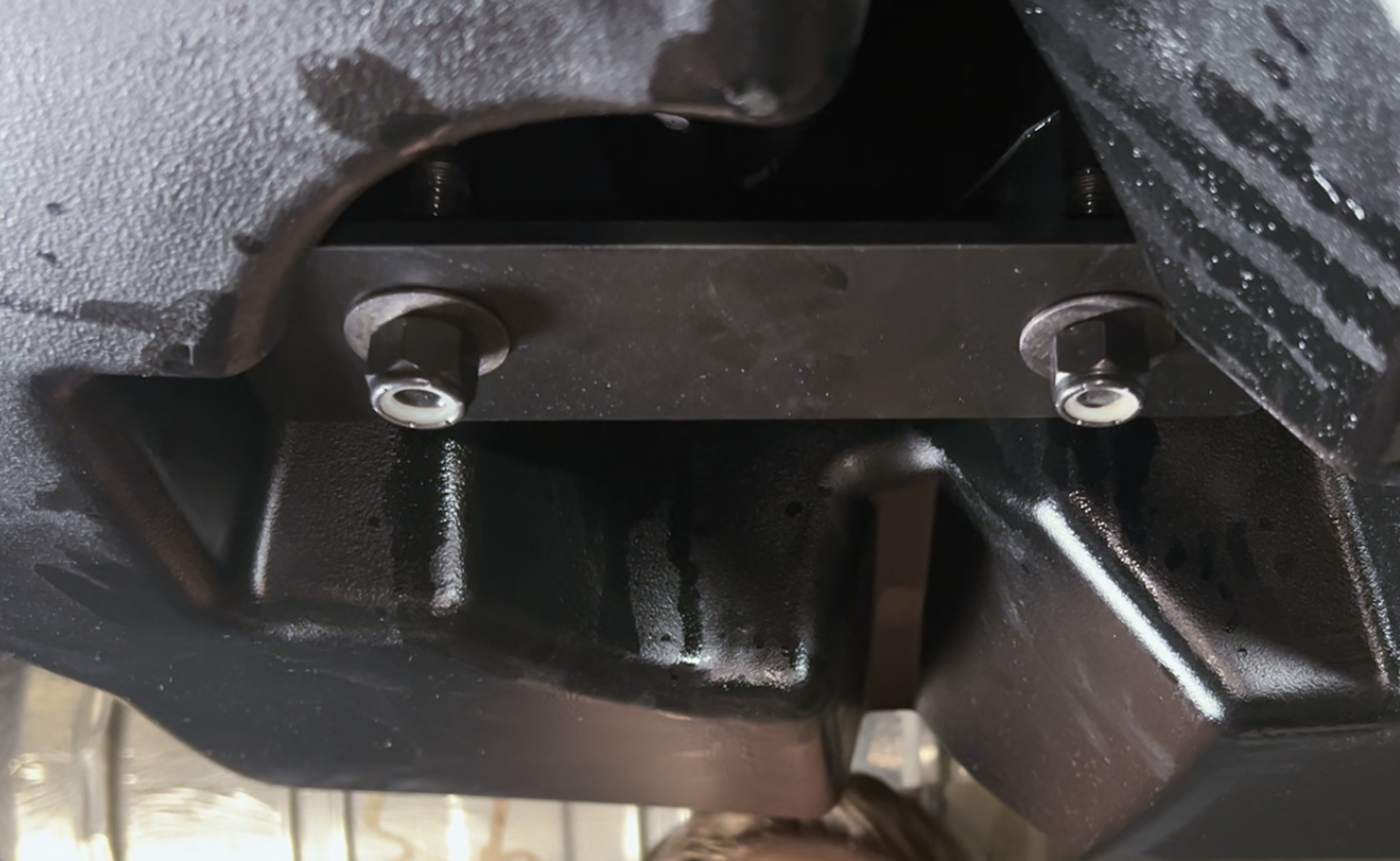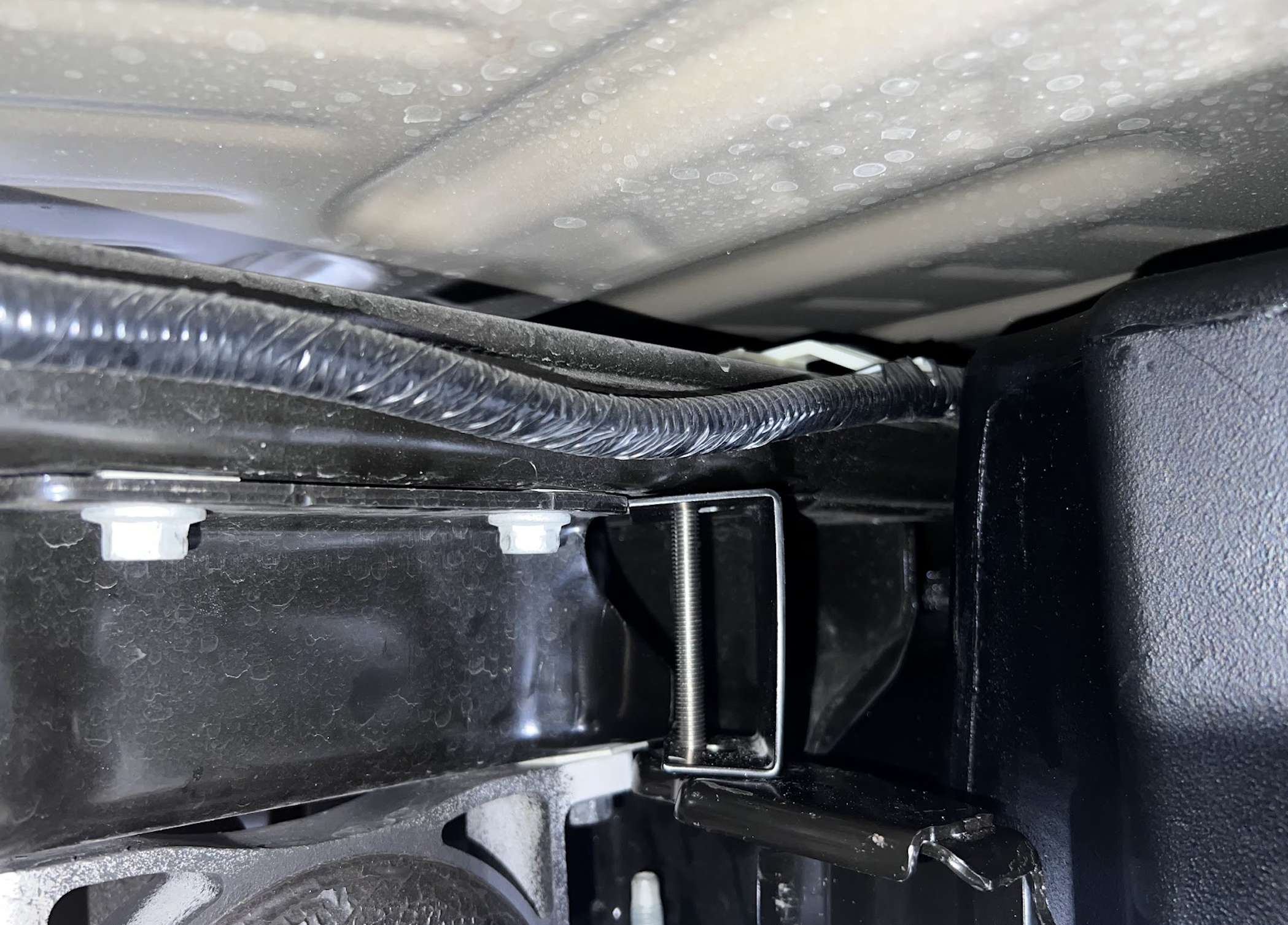 To reinstall the OEM skid plate, the front hanger on the driverline side needs to be spaced down and same with the front 2 on the frame side. Install the C shaped spacer between the crossmember and hanger. The longer section will go against the crossmember.