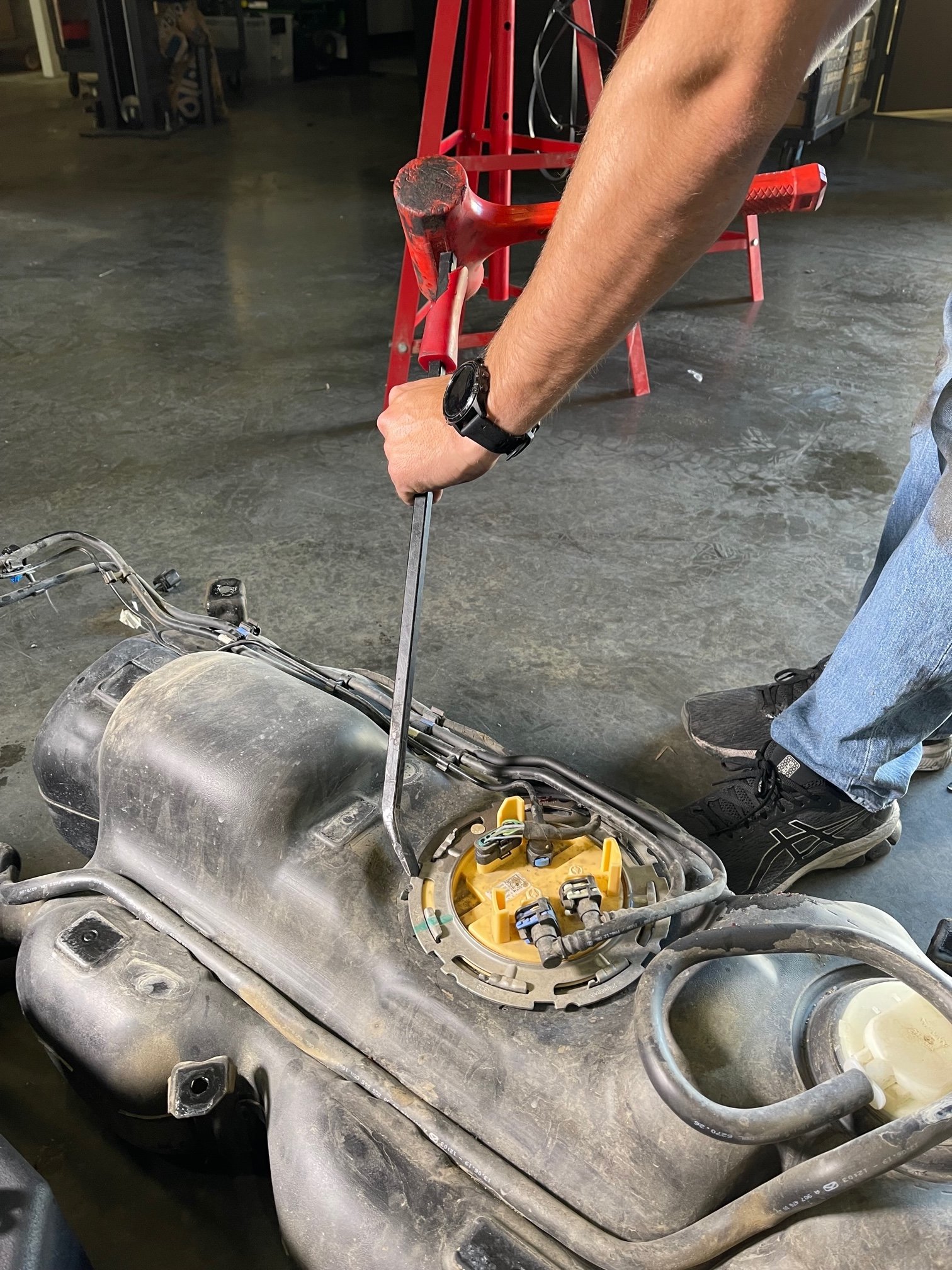 Remove fuel pump assembly from the old tank. This can be done by using a pry bar or screwdriver and hammer to remove the locking ring. Take the screwdriver and place it on the outside teeth of the locking ring and firmly pound the locking ring counter clockwise until it releases. Pull fuel pump module out being careful of the orientation as you pull out (be careful of the float and the black pickup snake).