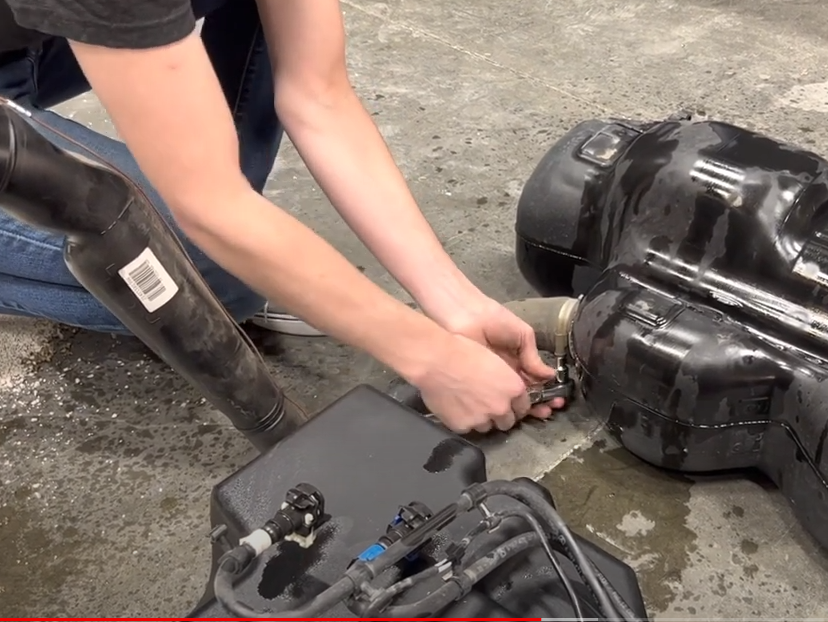 Disconnect the 3 fuel lines and the electrical connector. Remove the zip tie holding the electrical connector wire harness to the fuel lines. Please see minute 3 of the install video if you have questions on how to disconnect the lines or electrical connector