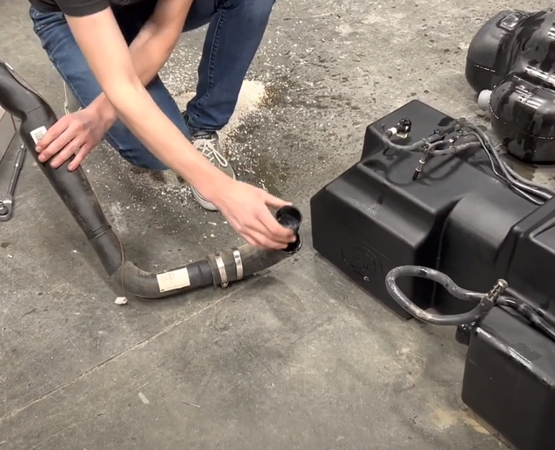 Next loosen (6) 11mm bolts holding 3 straps to the tank and retain the bolts for installation of the S&B tank. Lower tank and remove it from under the vehicle.