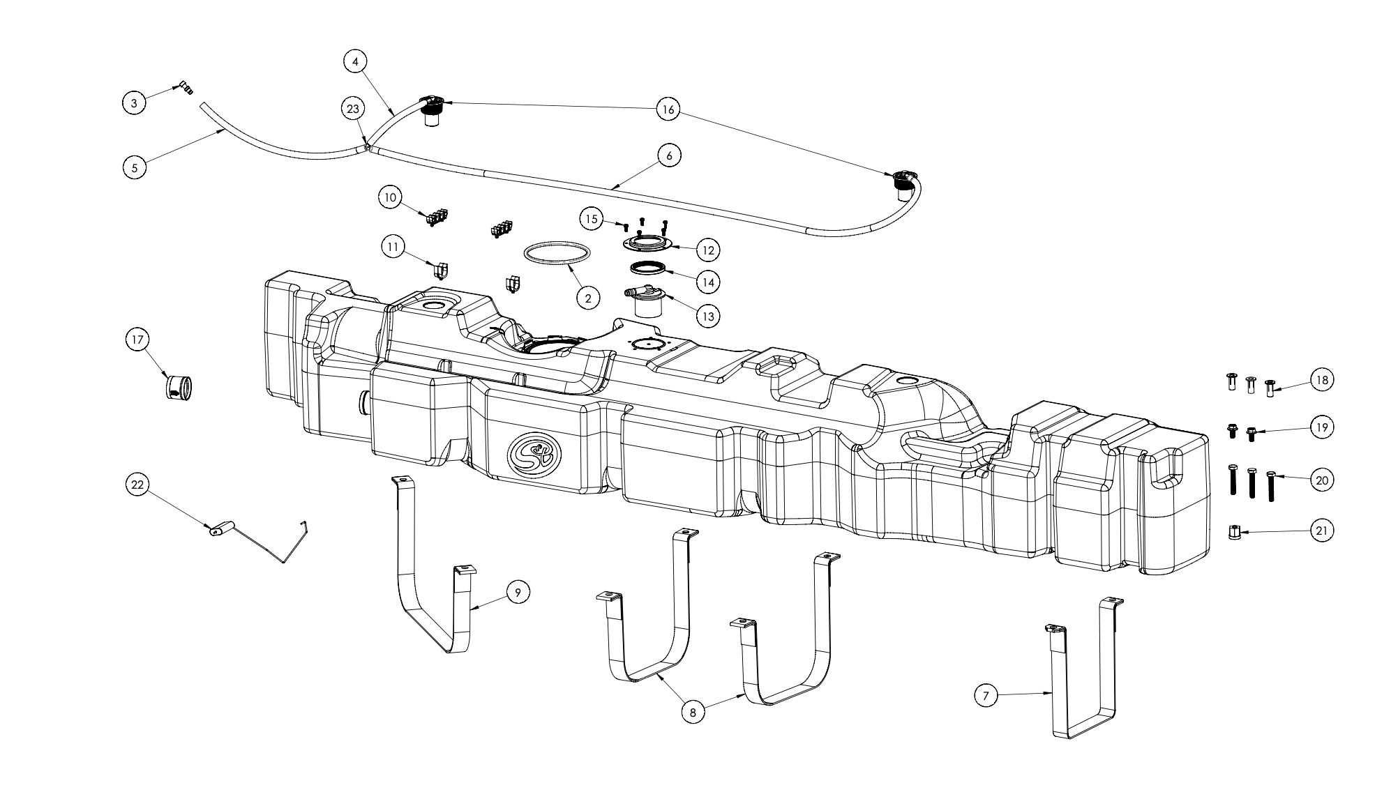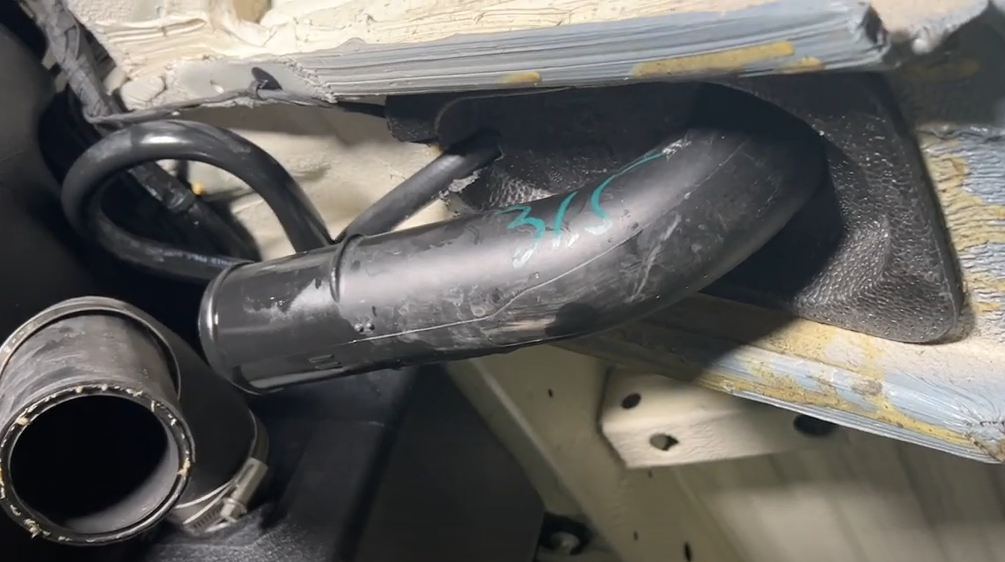 Now the S&B Tank is ready to be installed. Use a lift or straps to lift the tank into place. Before the S&B Tank is all the way installed, push the 5/16" hose that's coming from the filler door onto the T fitting on the S&B Tank. Make sure this line does not get pinched when the S&B Tank is fully in place.