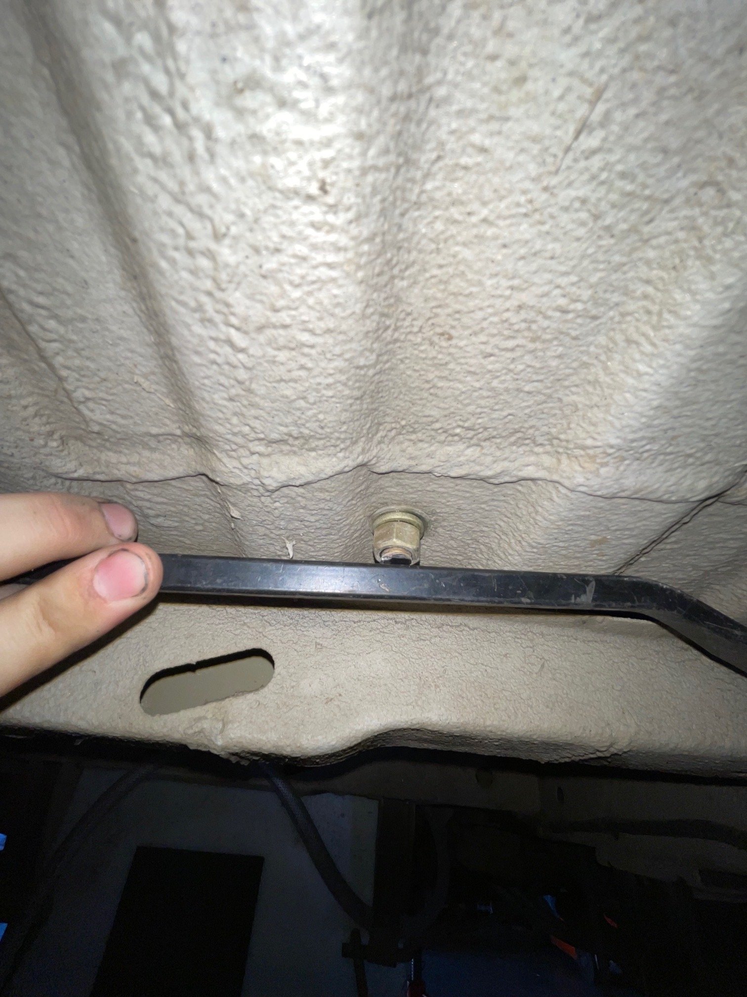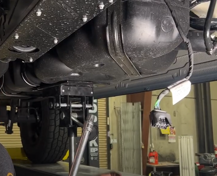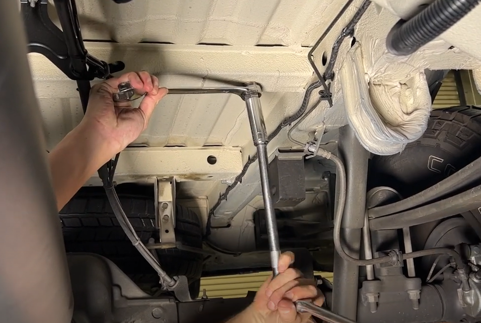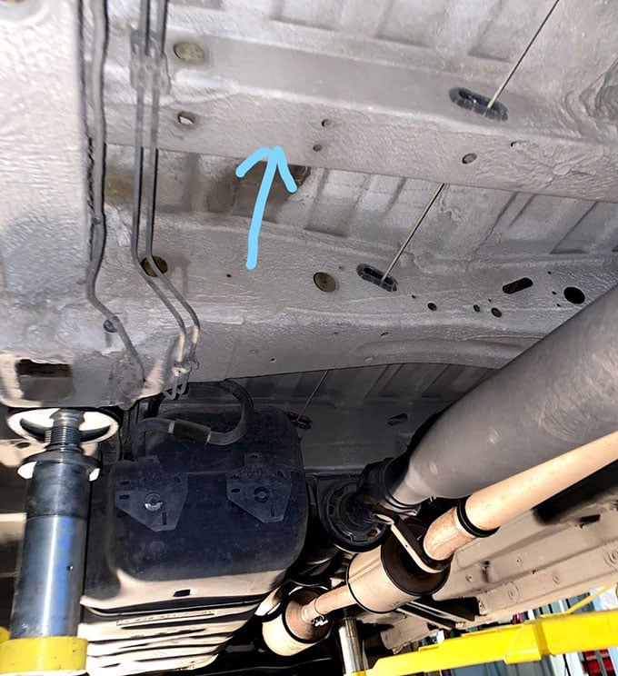 With a 11mm socket, remove the 3 tank straps. Support the tank with a jack or ratchet straps during this step. You do not need to drill or open up any holes for these plus nuts. Insert, the the plus nuts into the crossmember holes.