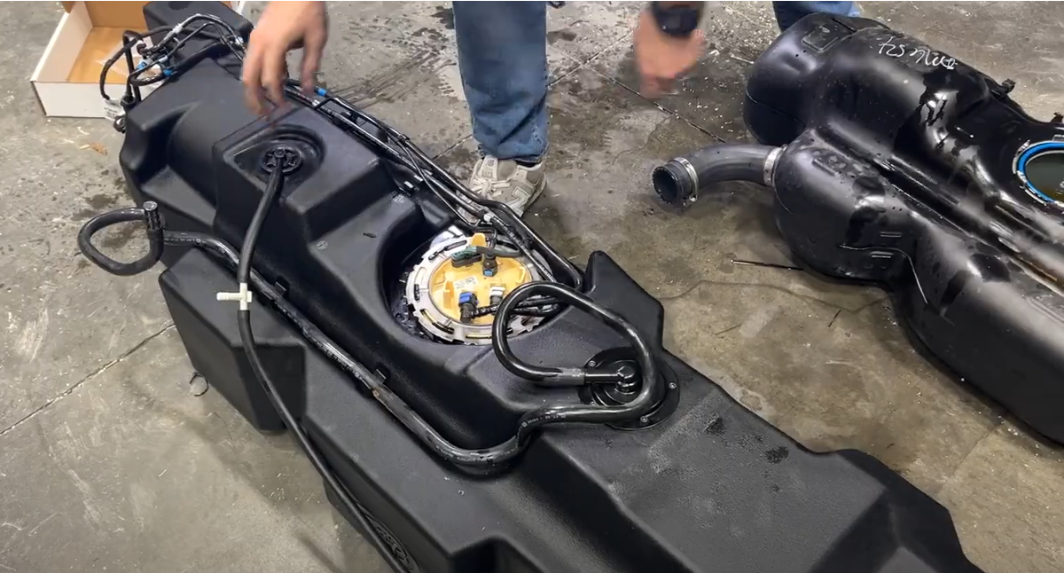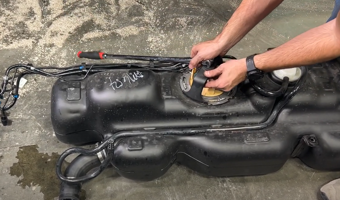 Either with a special fuel locking ring tool or a dead blow and pry bar, rotate the locking ring counterclockwise to remove the fuel pump. Pop out the fuel lines and electrical line from the holder on the OEM tank and remove the fuel pump from the tank. Pour out the fuel from the bucket into the OEM tank and be careful to not damage the fuel float when removing. This tool can be purchased on Amazon or your local auto parts store by searching "Universal Fuel Tank Lock Ring Tool Fuel Sender Tank"
