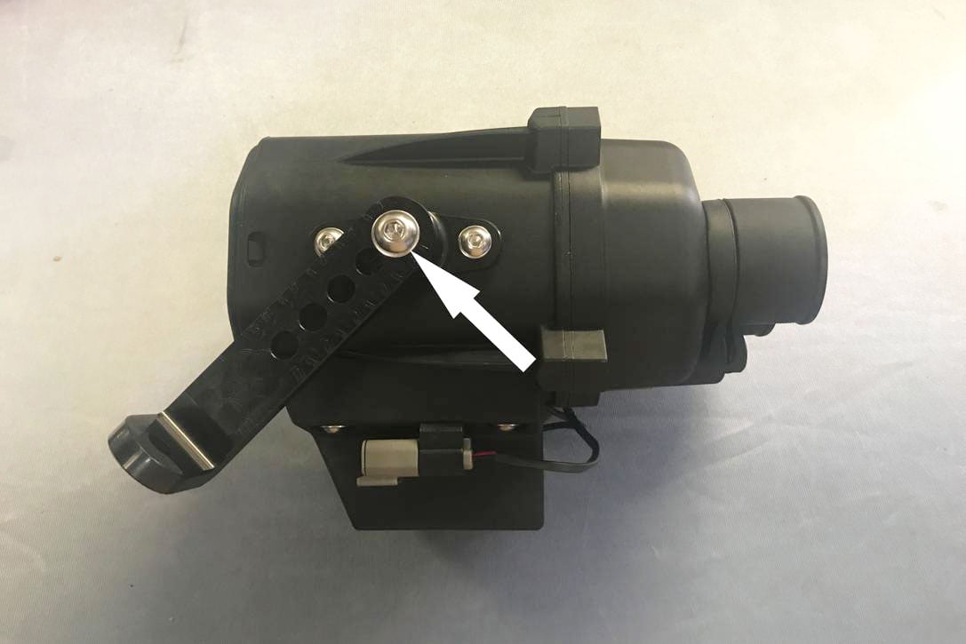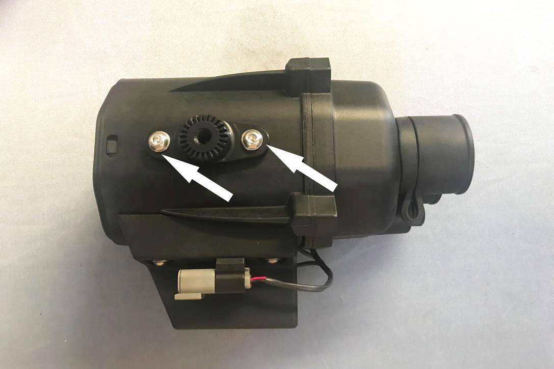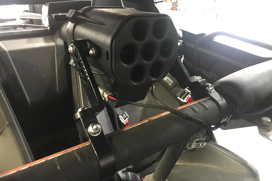 Determine where you want to mount the Helmet Particle Separator. The intake can face forwards or backwards, but it needs to be mounted horizontally, with the Exhaust Fan pointing straight down. It is recommended to mount the Helmet PS in an orientation where there is less dust entering the vortex separators. Also note the Fan Speed Knob is between the Helmet Ports
