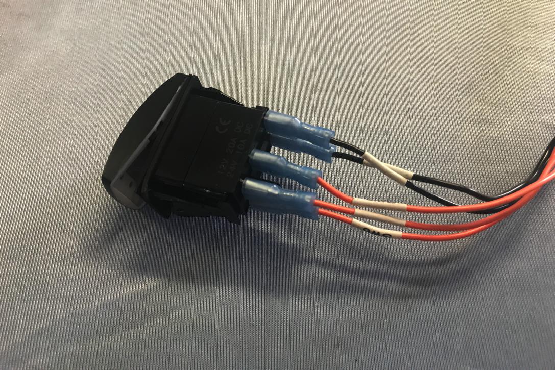Cut a 13/16” by 1 7/16” hole in the desired mounting location for the Rocker Switch. Use a file to slowly open up the hole for a precise fit. Plug the female spade terminals into the corresponding male spades on the Toggle Switch. Optional, if you choose to use your own 2 post switch wire #2 & #6 together on one post, and #3 on the other post, then exclude #7 & #8 which are grounds.