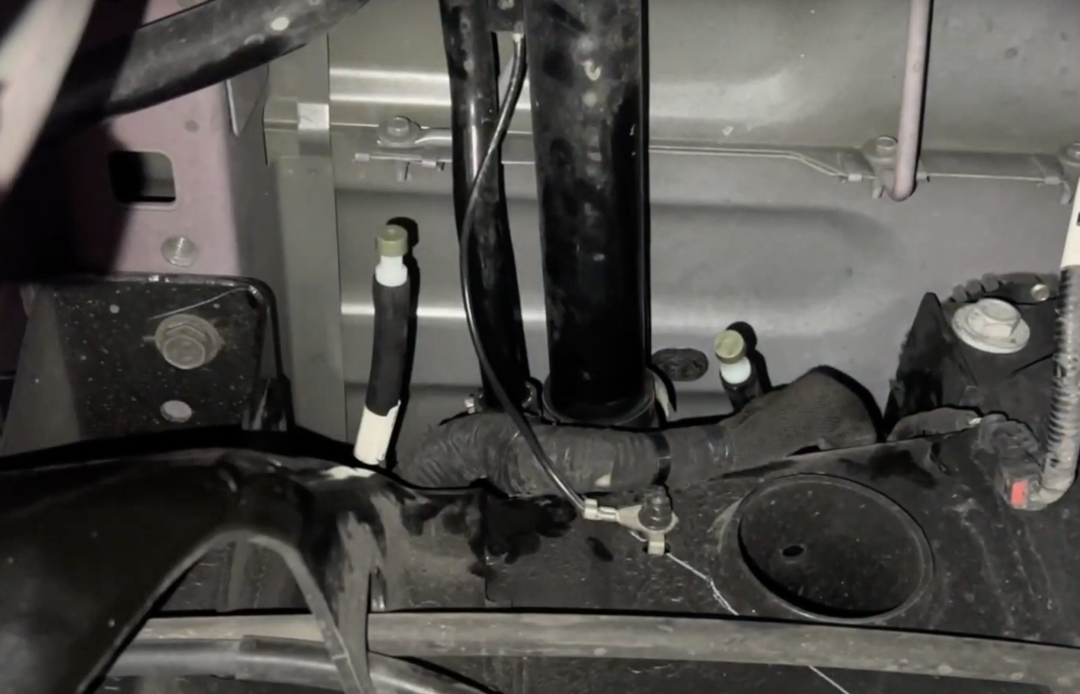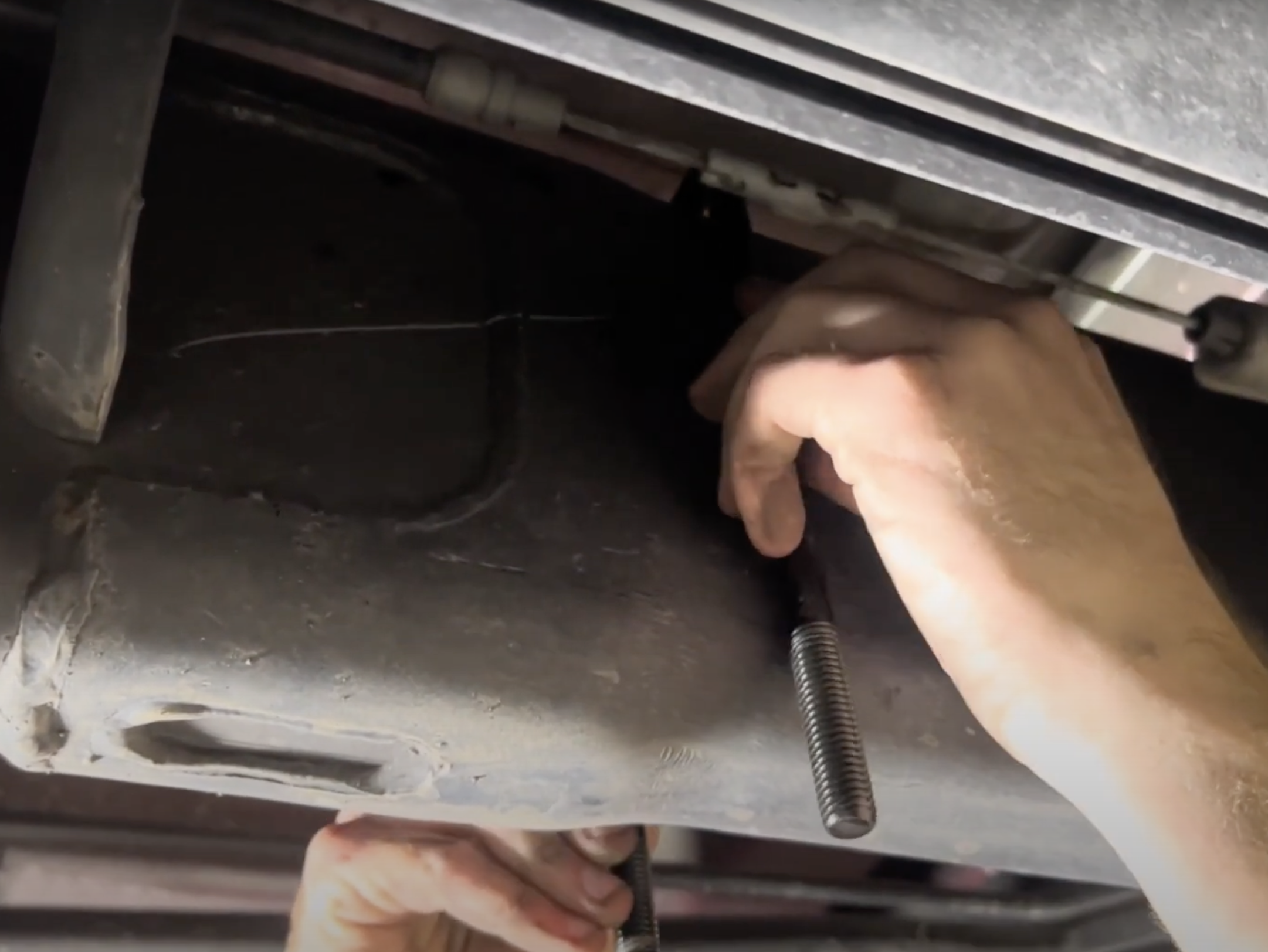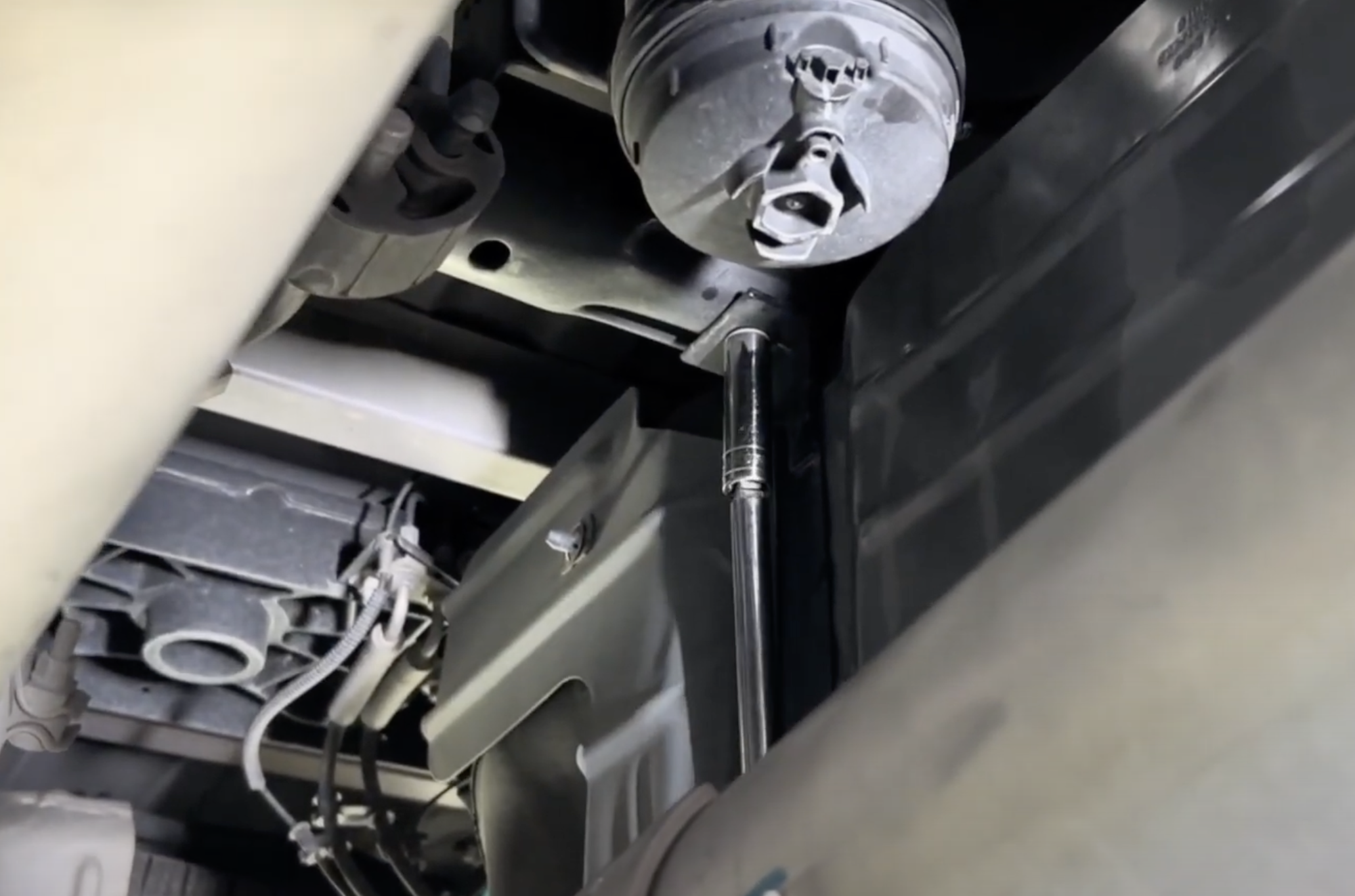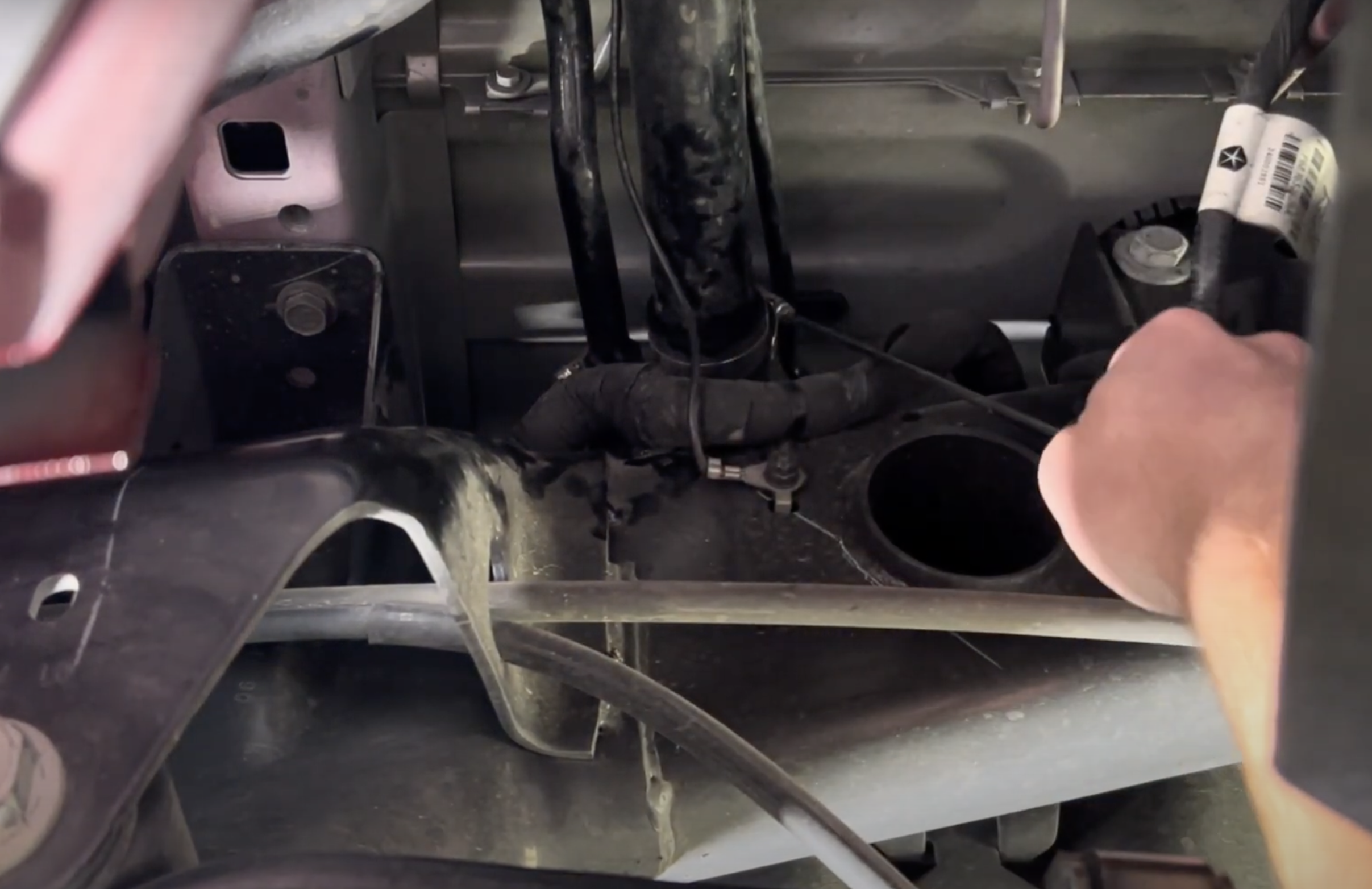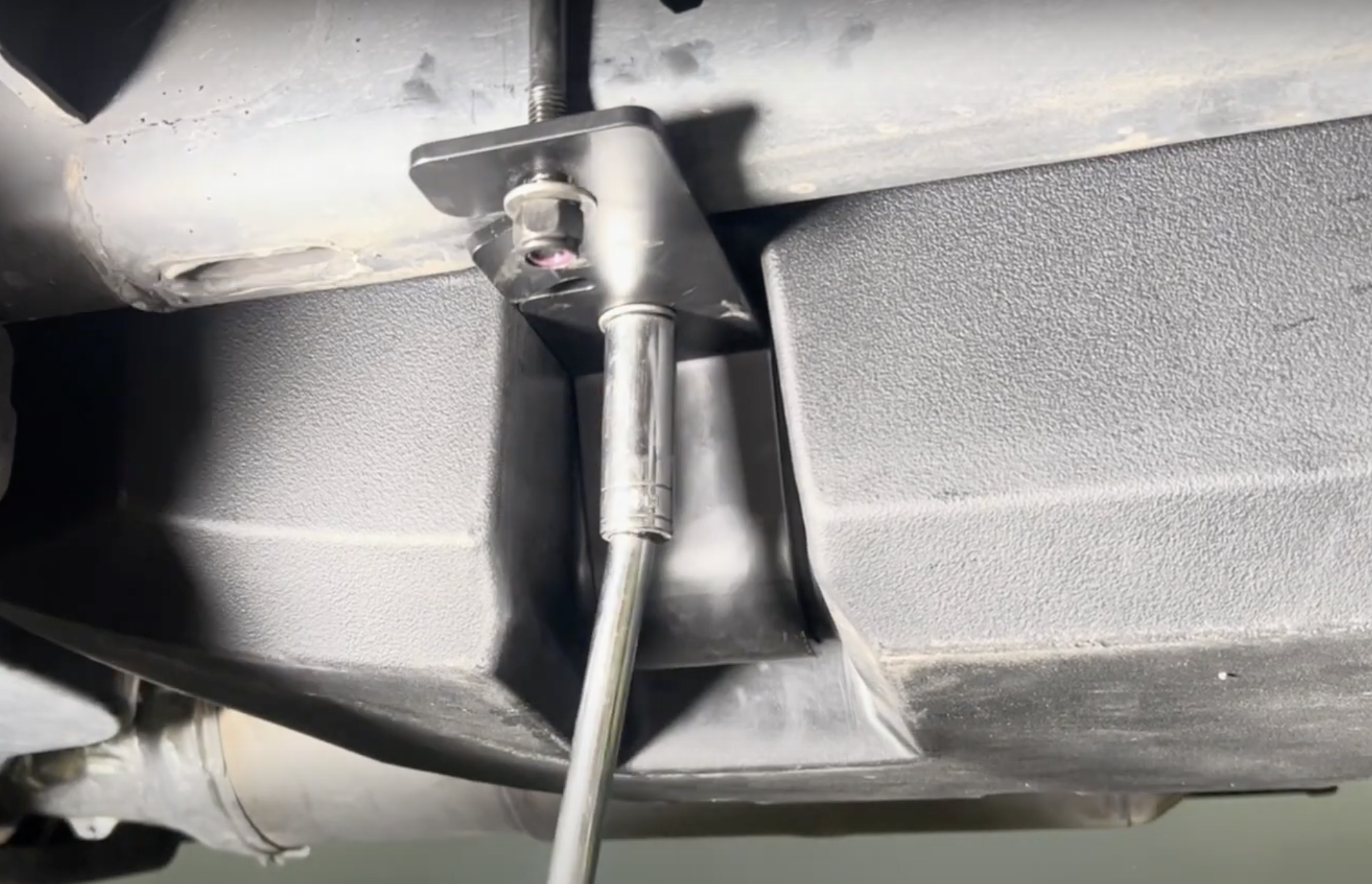 Reinstall the longer strap by clipping the frame side into place and installing the driveline side with the nut. Once the nut is in place and connected with the mounting stud, tighten down.