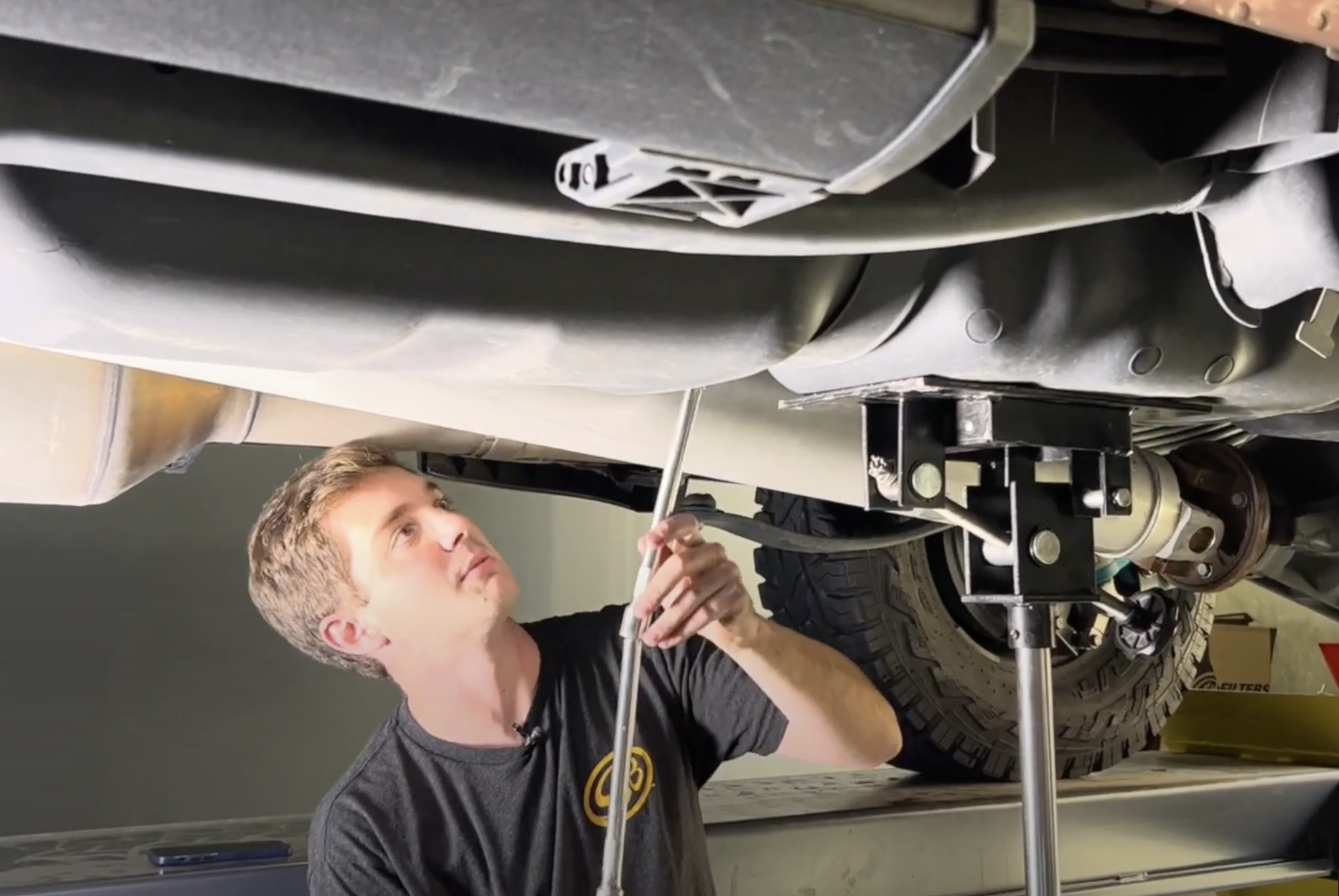 Install the U-Bolt for the front mounting support. To install, slide it up and over the frame rail and make sure there is plenty of room around the fuel and brake lines.