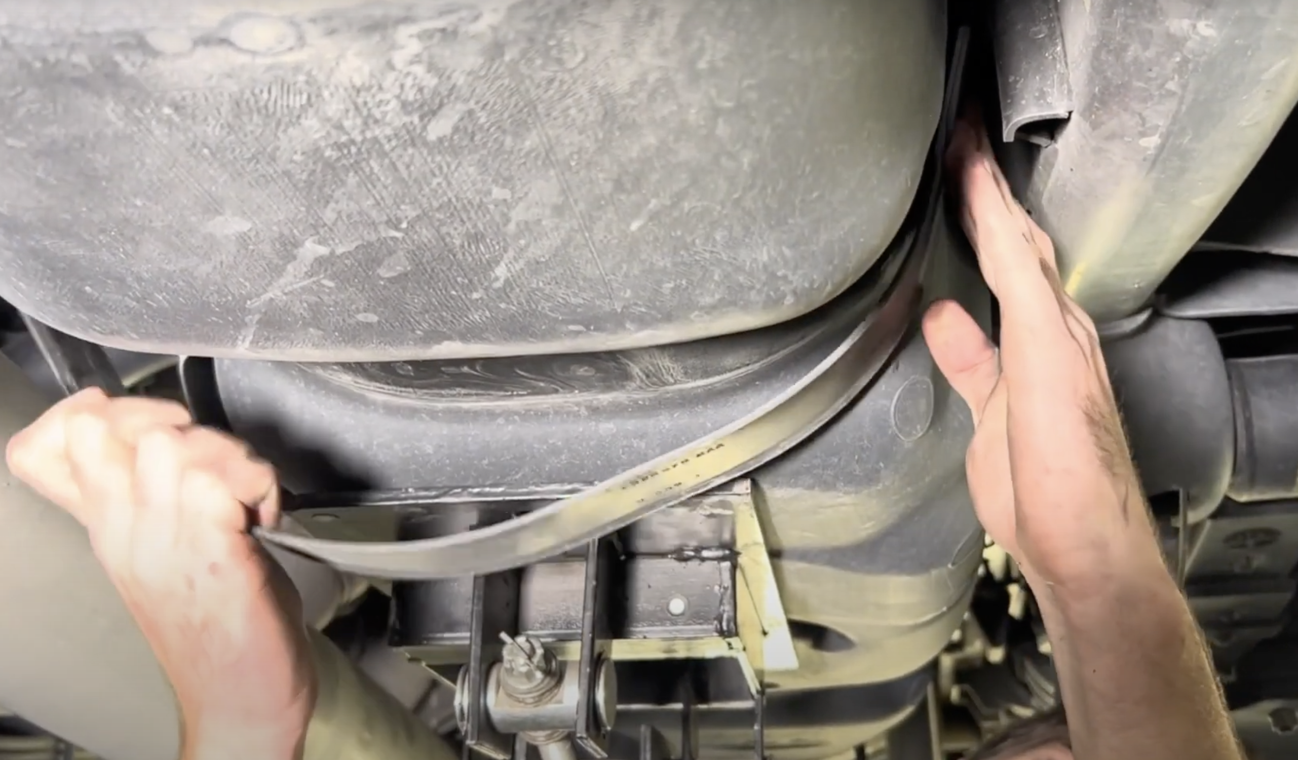 With the jack underneath the tank, remove the bolts securing the front and near strap.