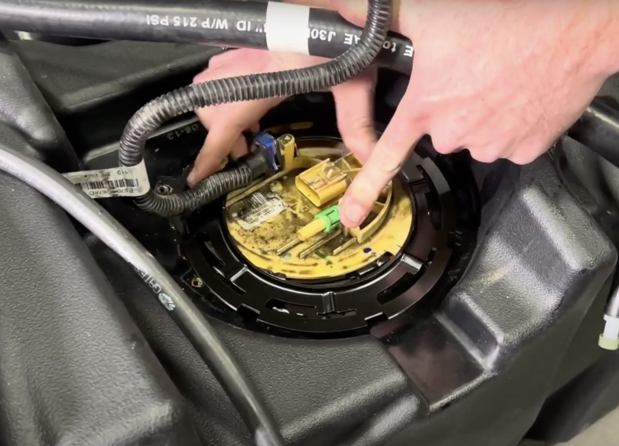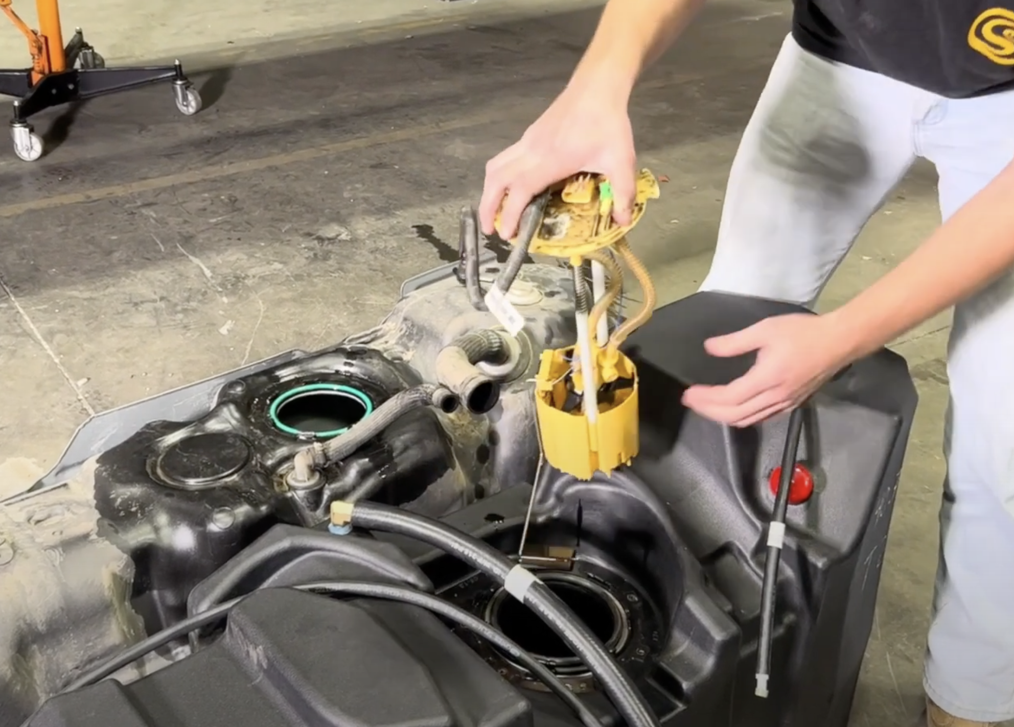 Once the locking ring is off, begin transferring the sending unit over to the S&B tank. We will provide you with a new O-ring that must be used. When installing the sending unit, make sure to point the tab towards the arrow on the tank. There will be two different arrows on the tank, make sure you line up the correct one according to the year of your truck.