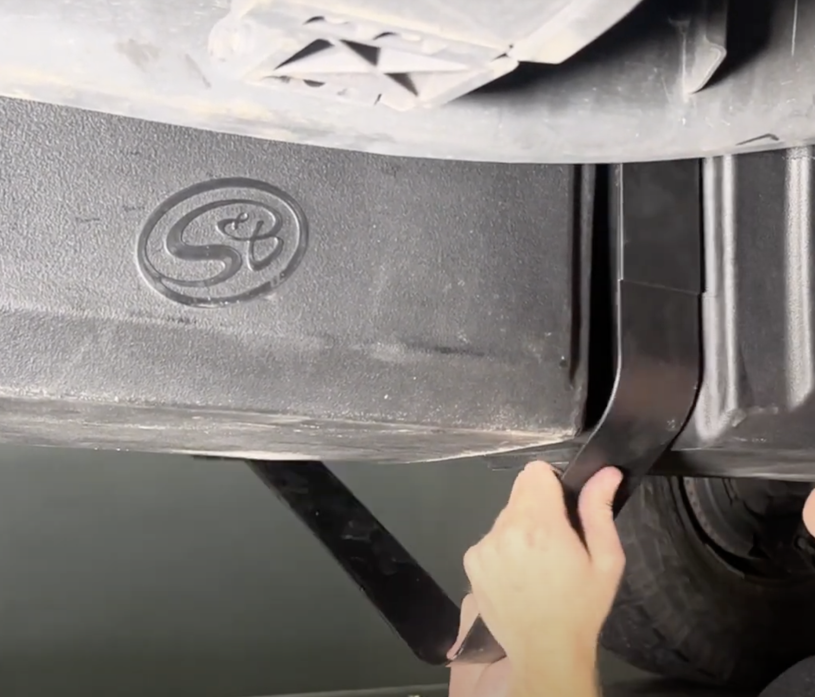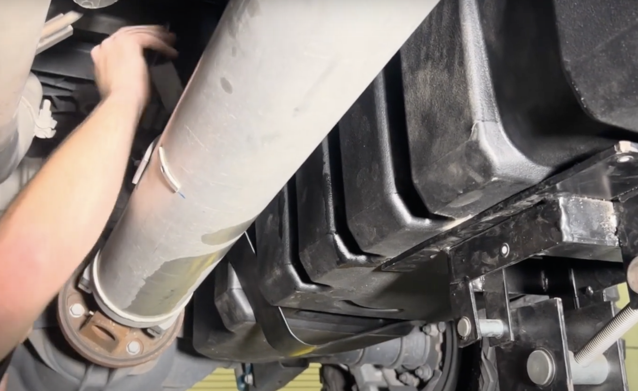 Begin raising the fuel tank up and make sure the filler neck goes over the rear crossmember, as well as the rear rollover vent line that comes from the fuel tank.