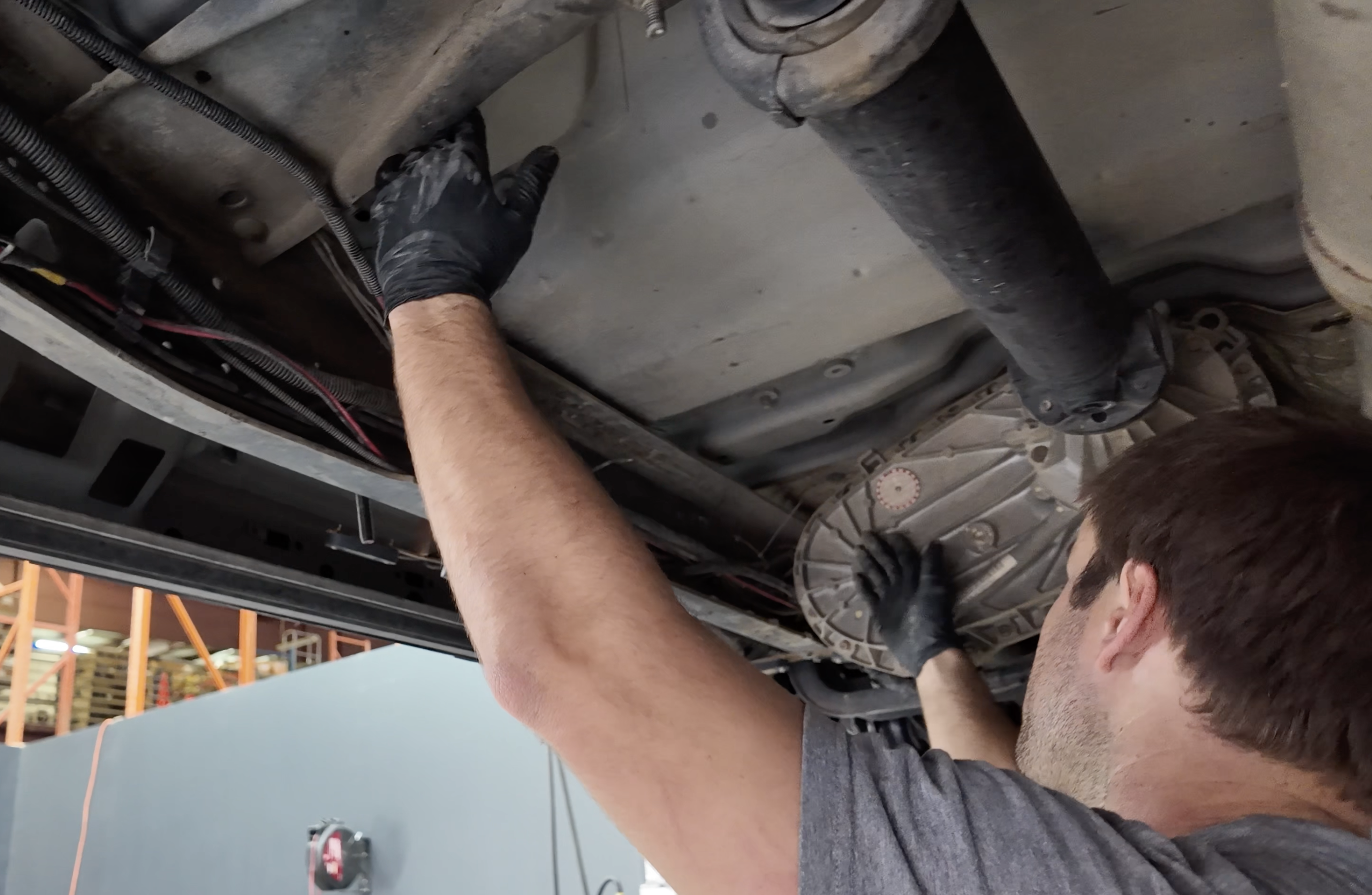 Install the S&B middle hangar first. Start by routing the driveshaft side first as you'll need to navigate the 90-degree section of the bracket around the driveshaft. Then you can bolt it up on the passenger side using a 13mm socket.