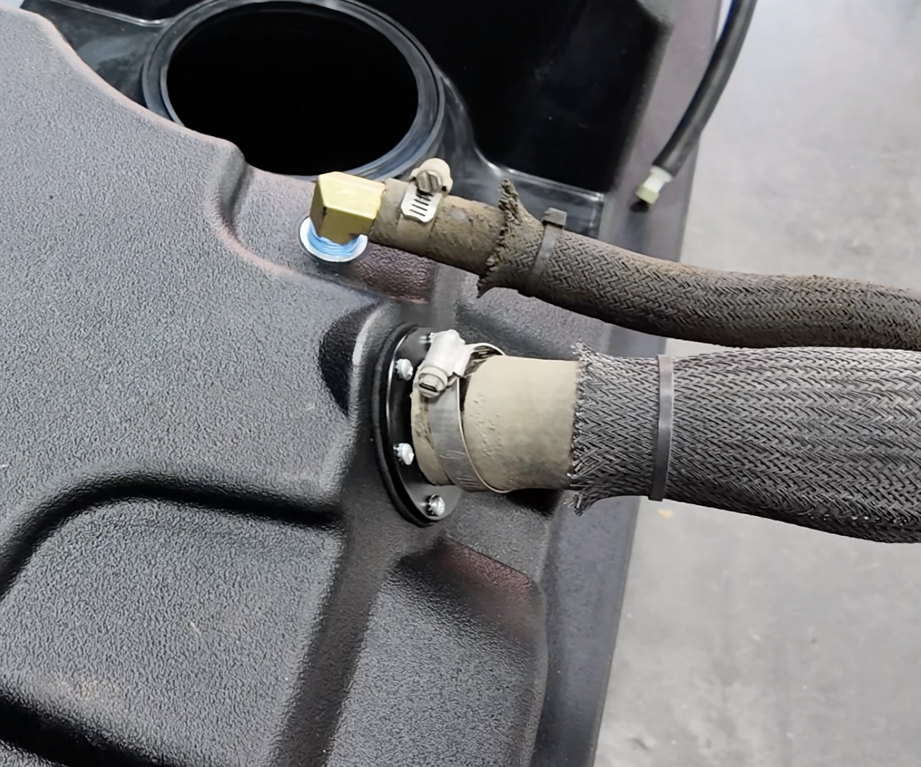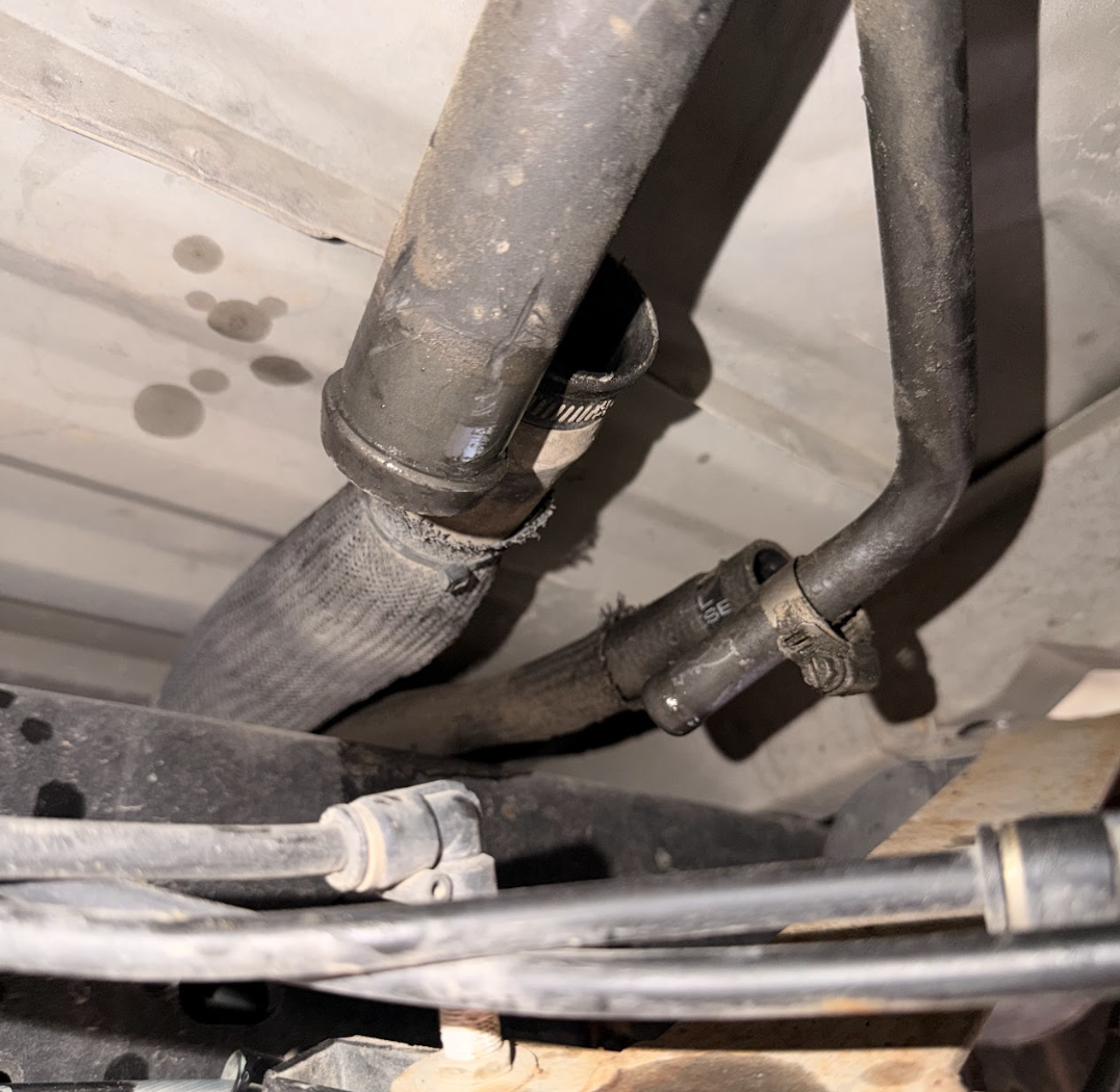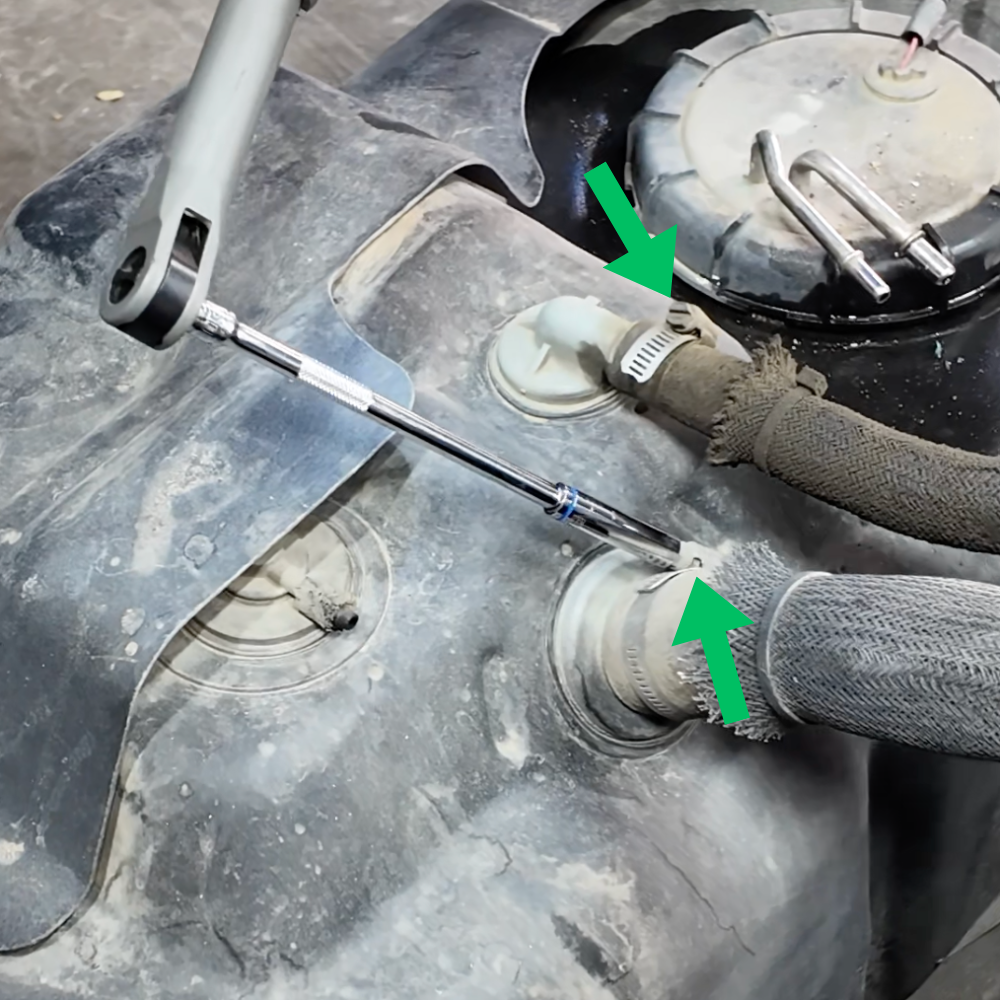 Using an 8mm, loosen the hose clamp on the filler tube port and the vent tube.