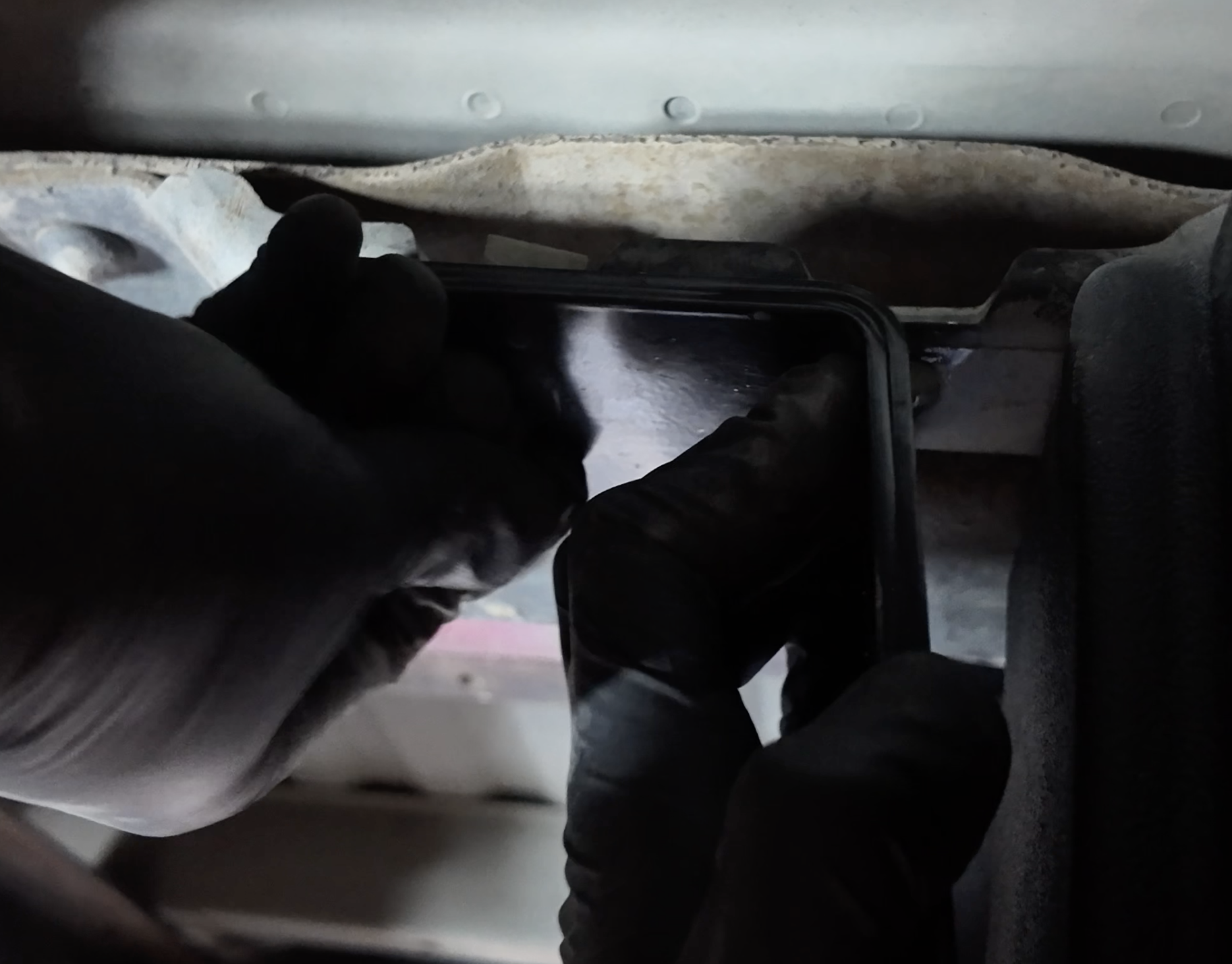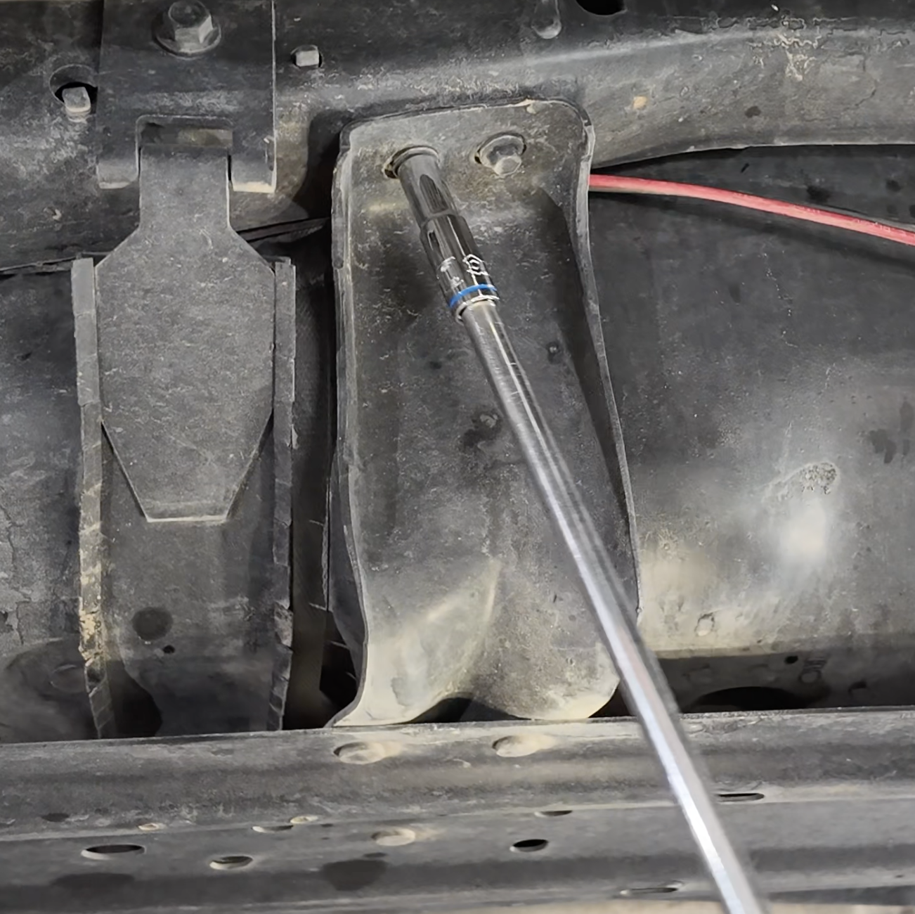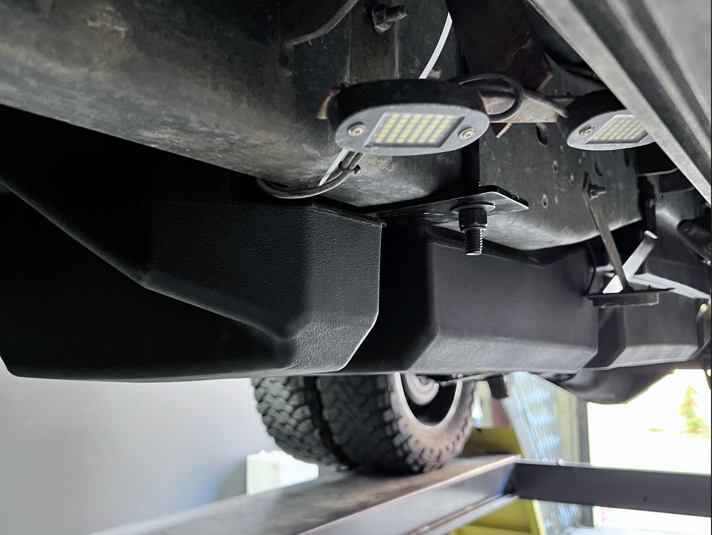 Using a 10mm socket, uninstall the OE fuel tank skid plate by removing the 8 bolts. There are 2 bolts on each corner of the skid plate. Before removing the final bolts, place a jack or have a buddy help you catch the skid plate so it doesn't fall.