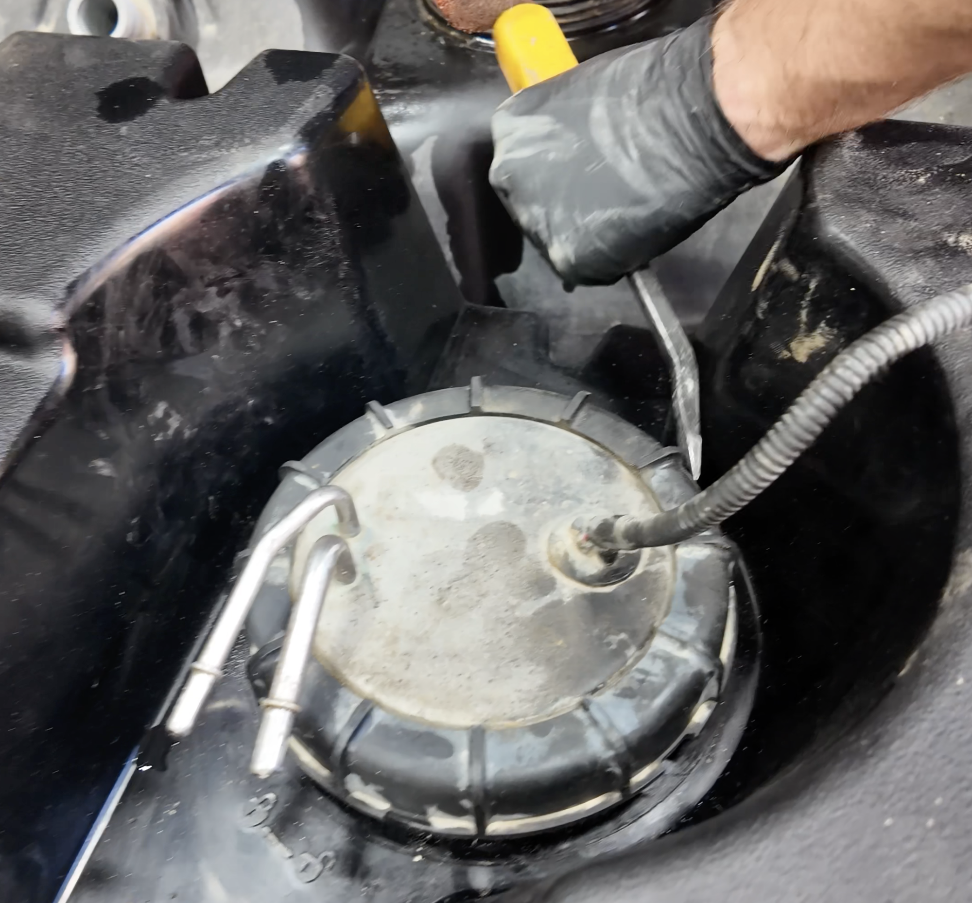 Now, go ahead and re-install the sending unit. Using a pry tool and rubber mallet, screw the ring by hitting it clockwise.