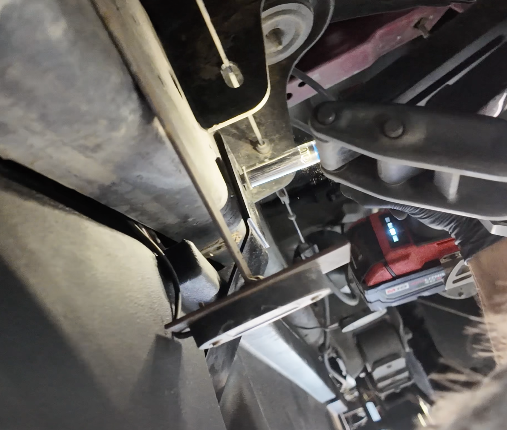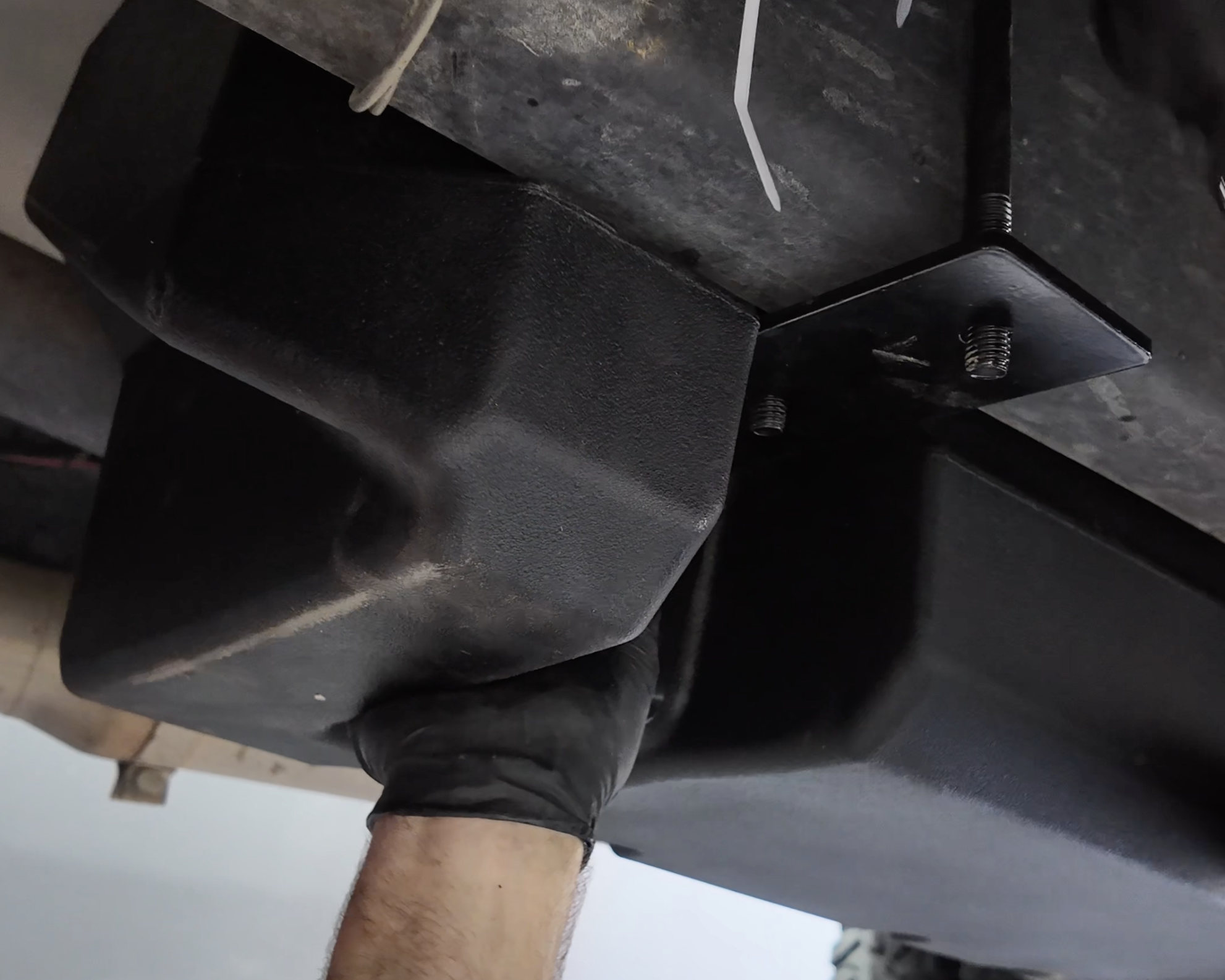 Bolt up the cross member side of the bracket. This can also be done with a 13mm socket.