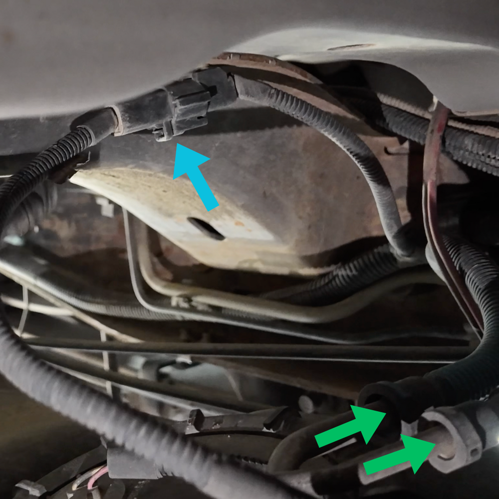 Drop the tank by a few inches to gain access to the 2 fuel lines (green arrows) and electrical connector (blue arrow) located at the top of the tank where the sending unit is.