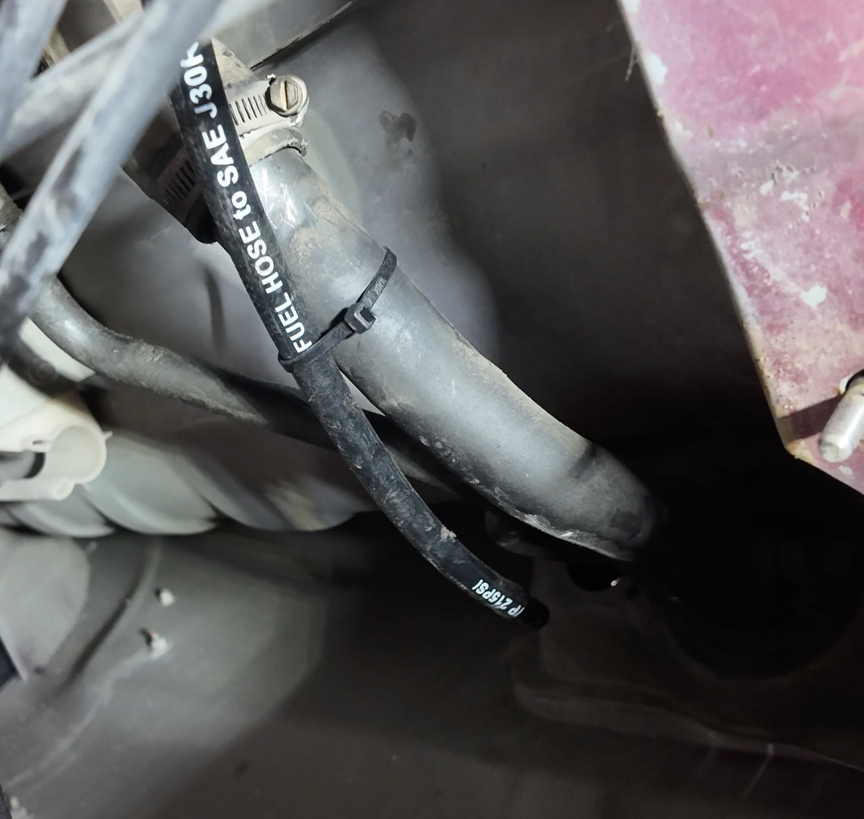 Take the rollover valve tube you ran along the upper frame rail, and run it along the filler tube. Then zip tie it secure.