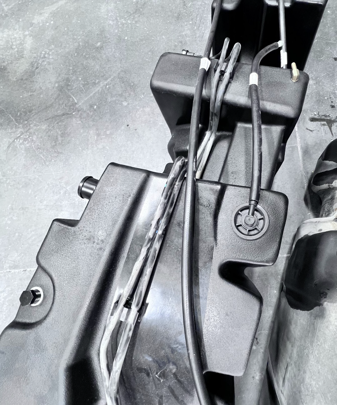 Snap in the fuel lines to the tabs on the fuel tank.