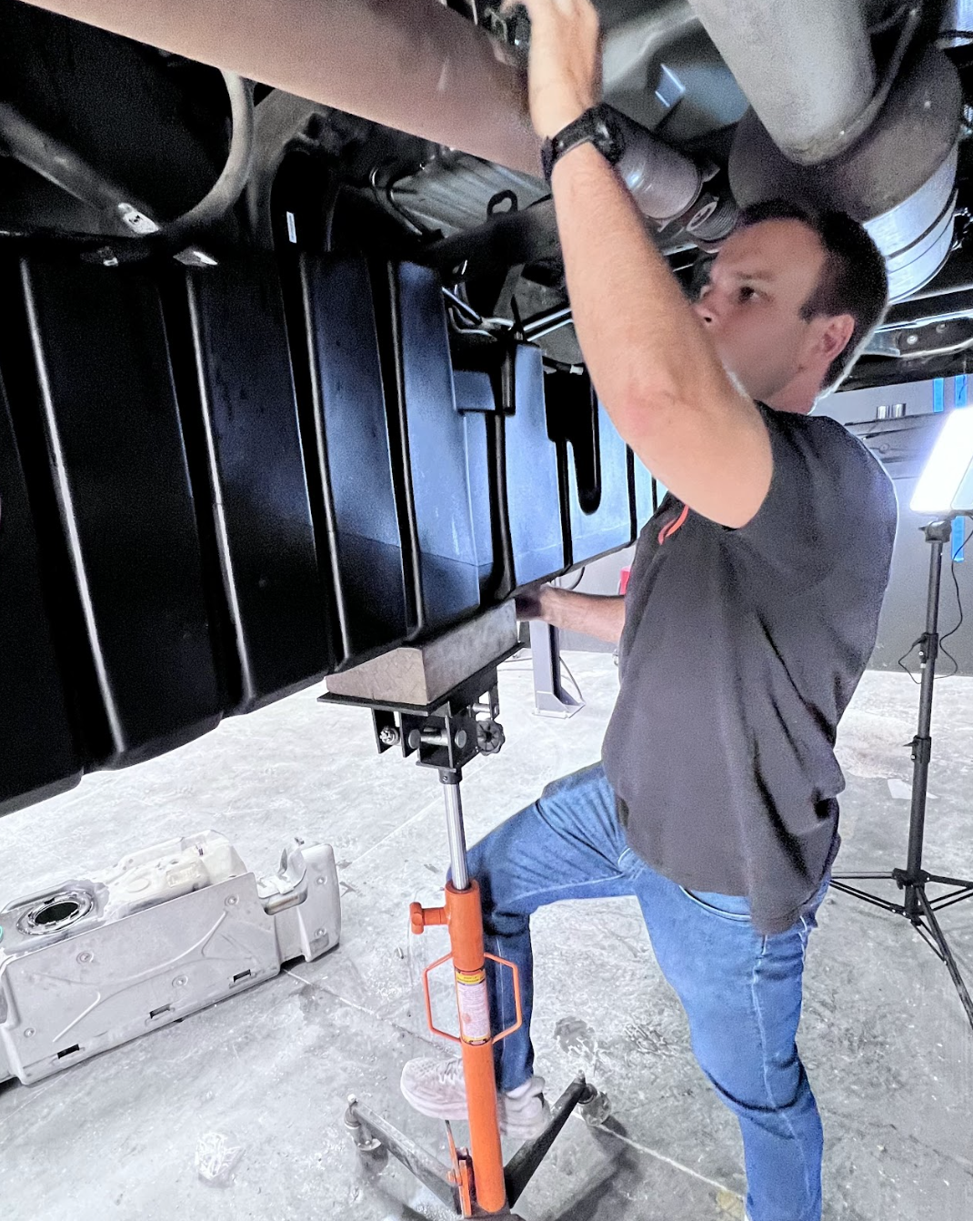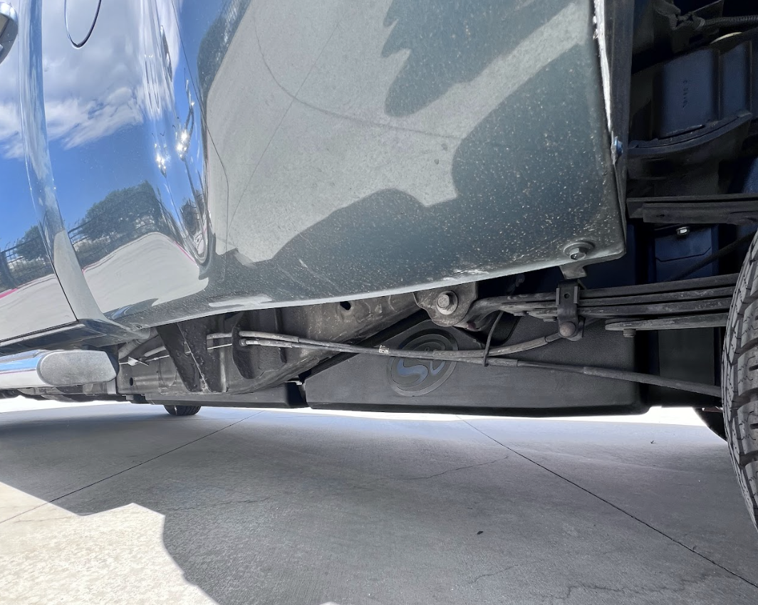 Now with a buddy, go ahead and lift the S&B Fuel tank into place. We recommend placing the transmission jack under it at this time. If you don't have a transmission jack available, you can run straps from frame rail to frame rail in order to keep it held up.