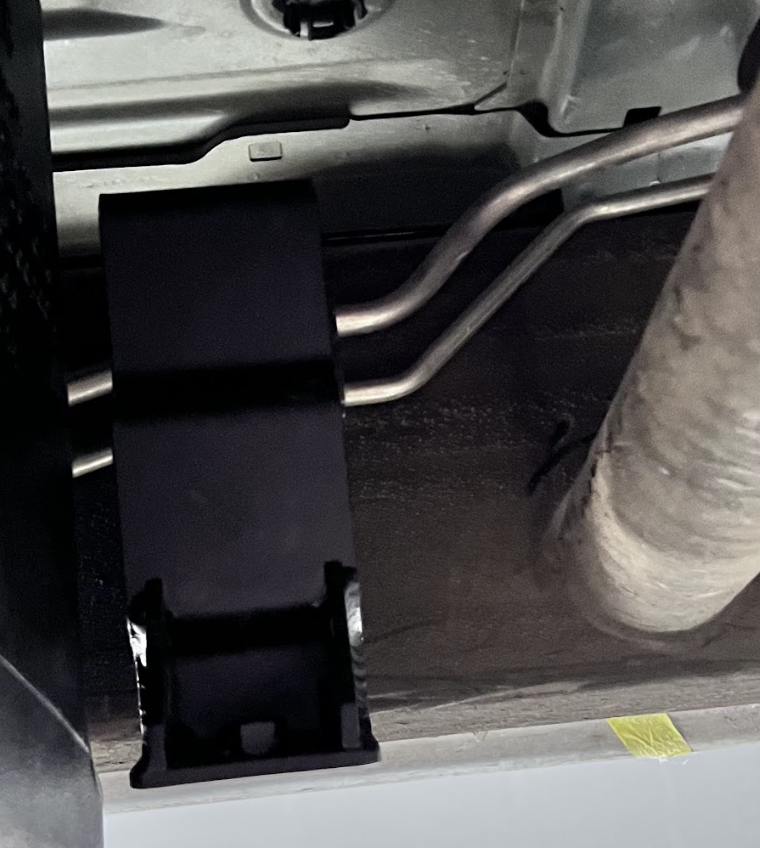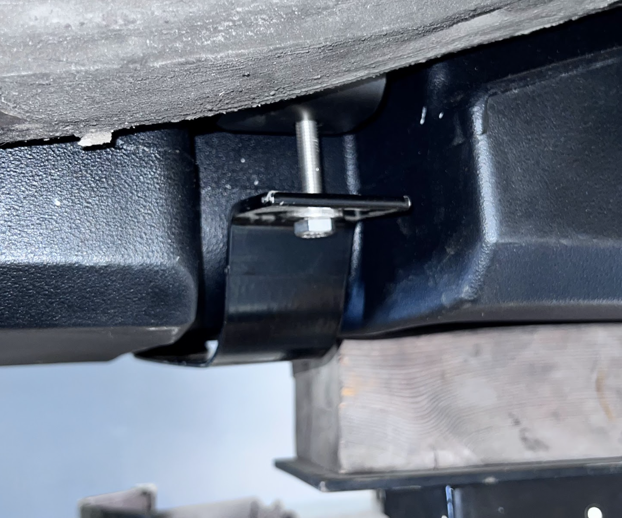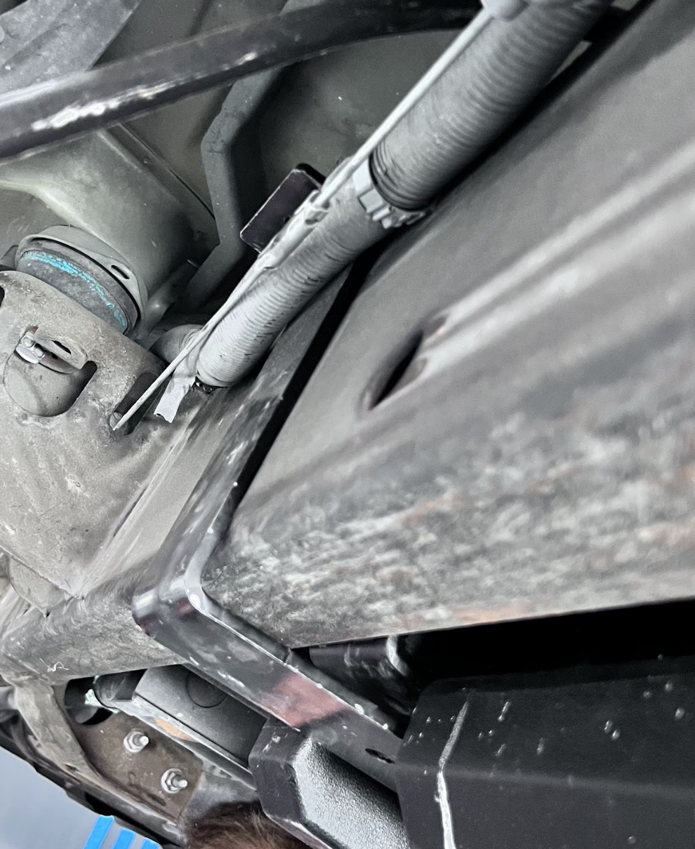 First, it'll need to go under the wire loom on the outside of the driver side frame rail. Once done, go ahead and line up the bolt holes of the two brackets.