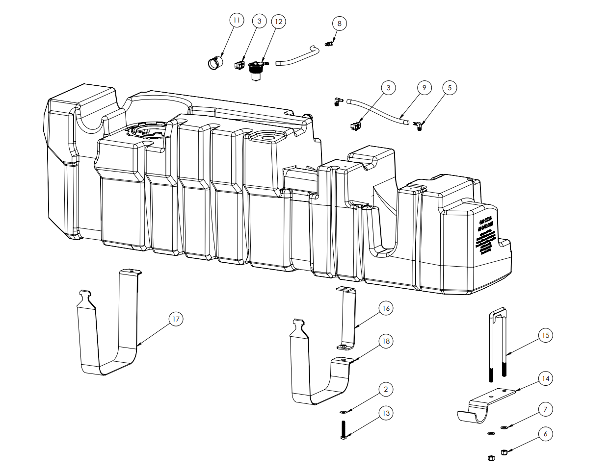 Install the included U-Bolt over the frame. Once installed, make sure there is space between the brake lines and U-Bolt. If the brake lines are touching the U-Bolt, call us and don't install the tank.