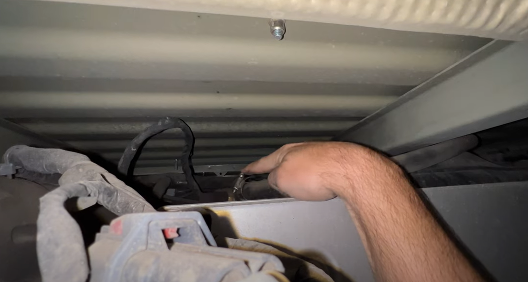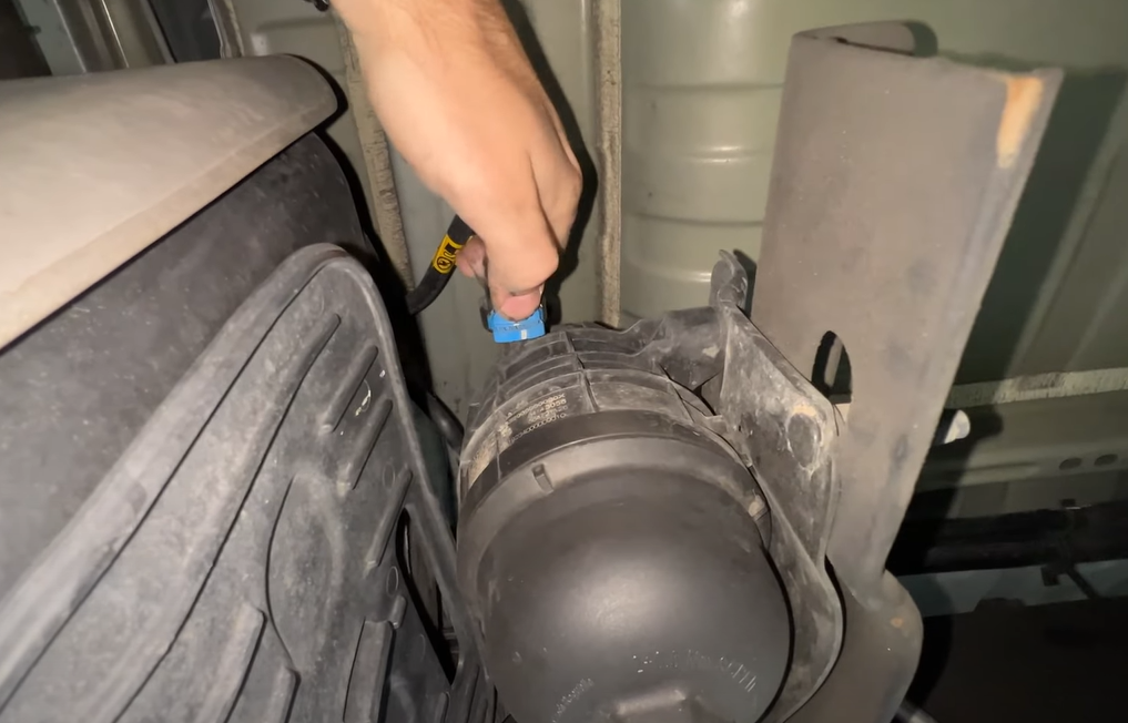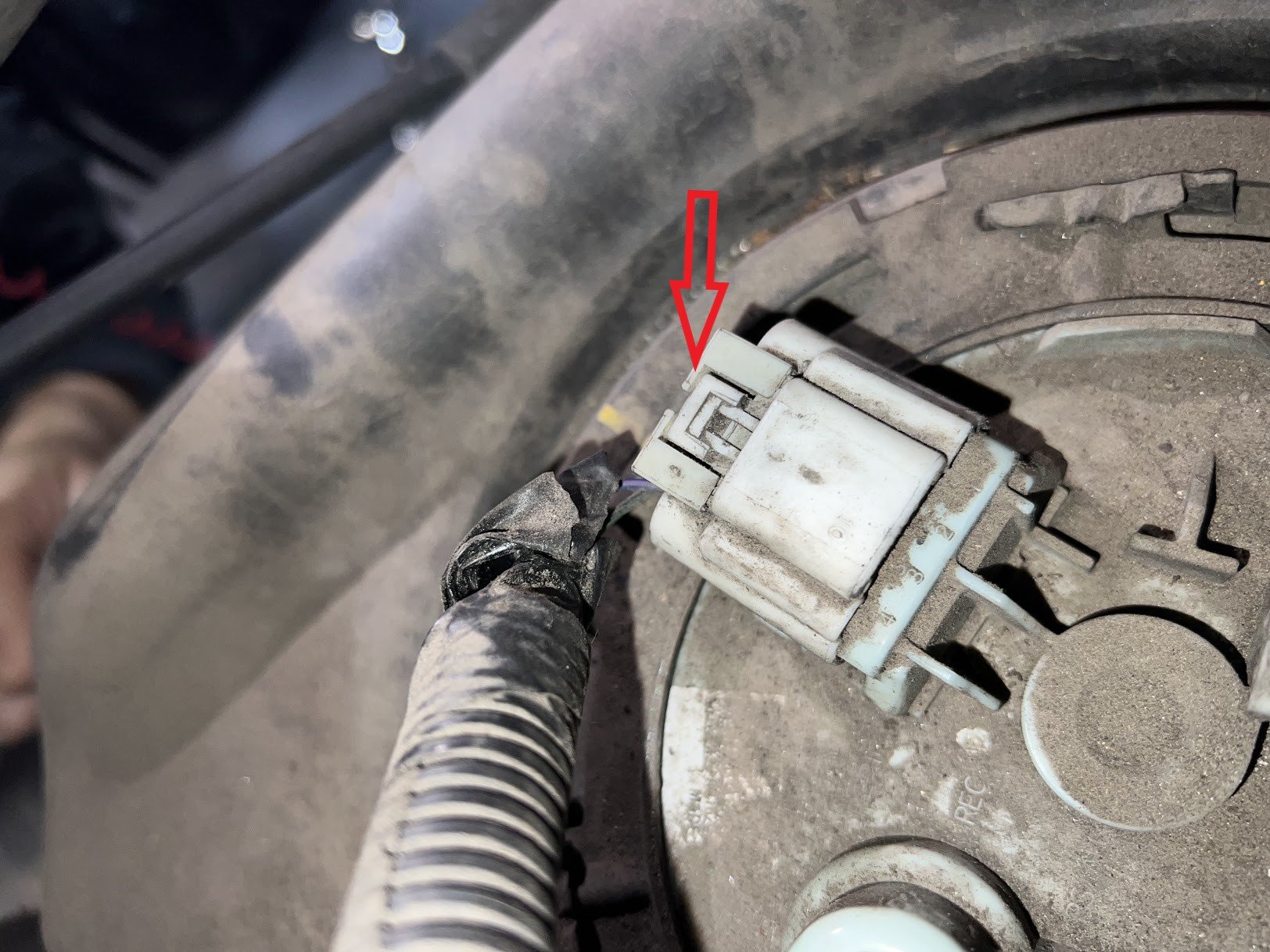 If you can reach the fuel sending unit electrical connector, you can disconnect it before dropping the tank. If you need more room to disconnect the connector, lower the tank 6" and disconnect. Slide the red lock out and depress the tab in the middle then slide the connector off.