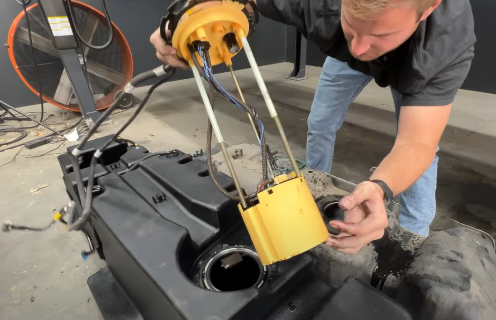 Place the included S&B oring in the oring groove on the S&B Tank. Install the sending unit and make sure to not damage the fuel float.