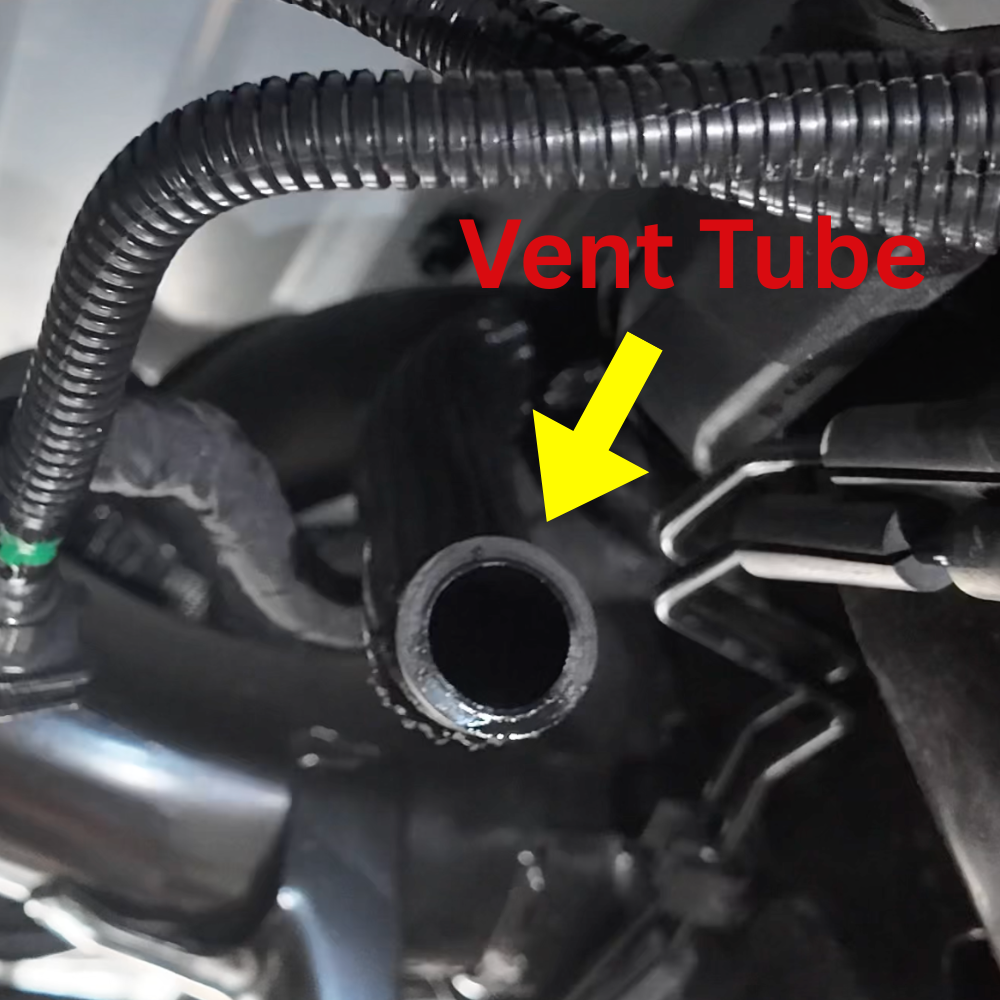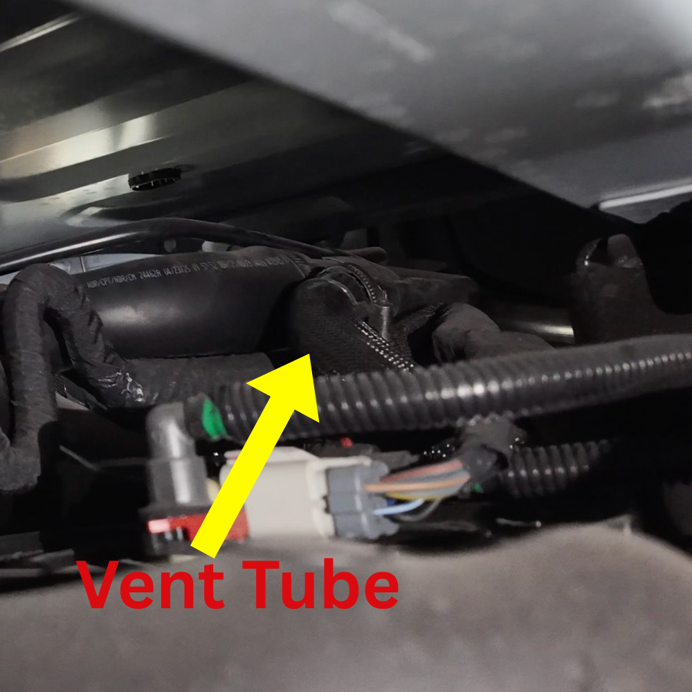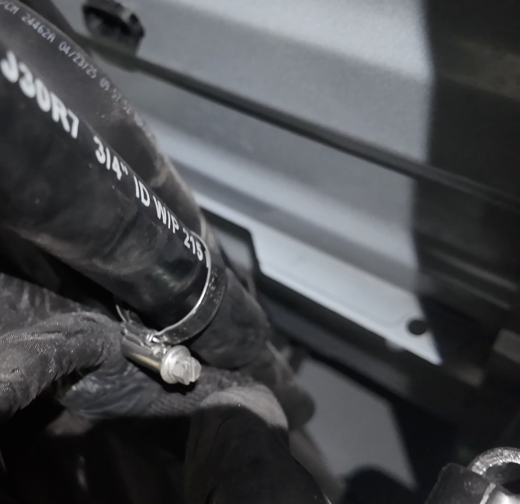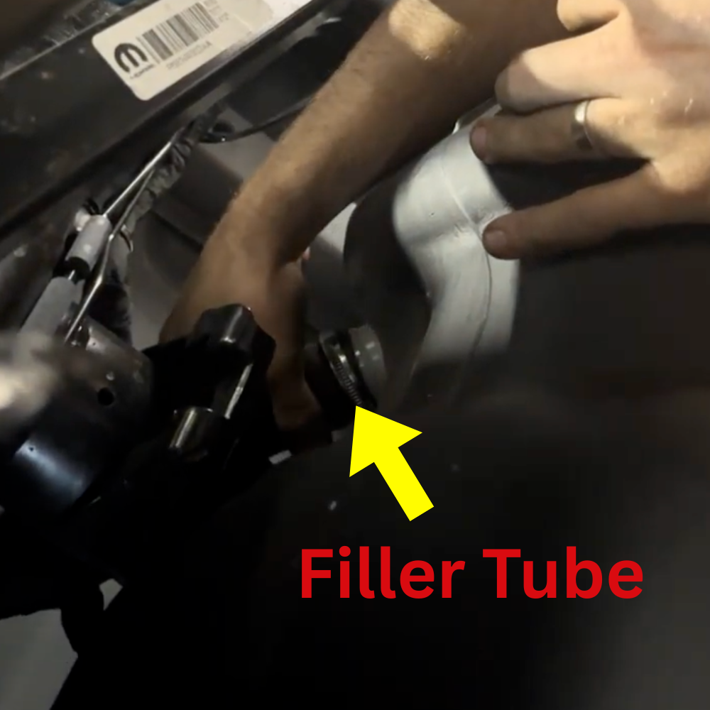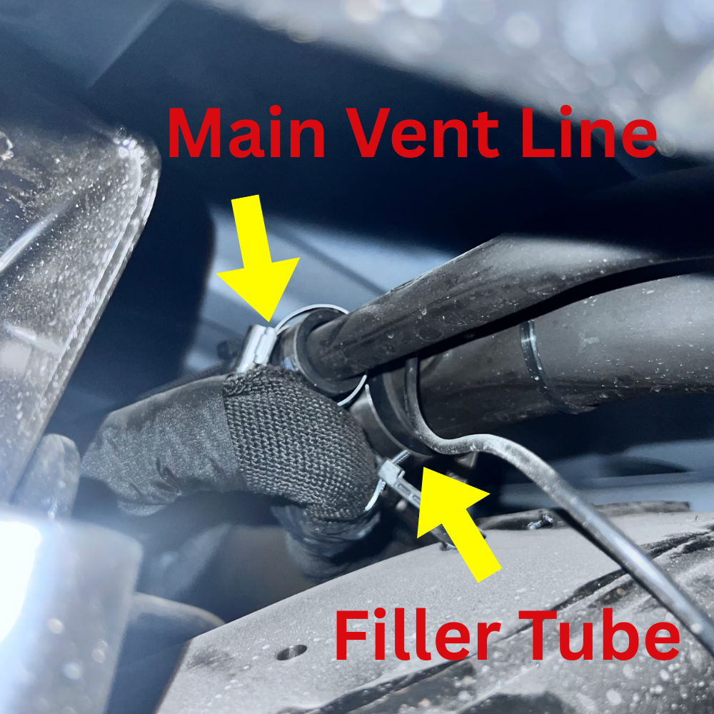 Using a 7mm socket, loosen the two hose clamps from the OEM Filler Tube and Main Vent Line. This will be located towards the rear of the vehicle, behind the Fuel Door, above the frame.