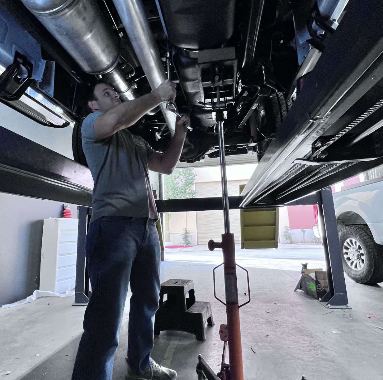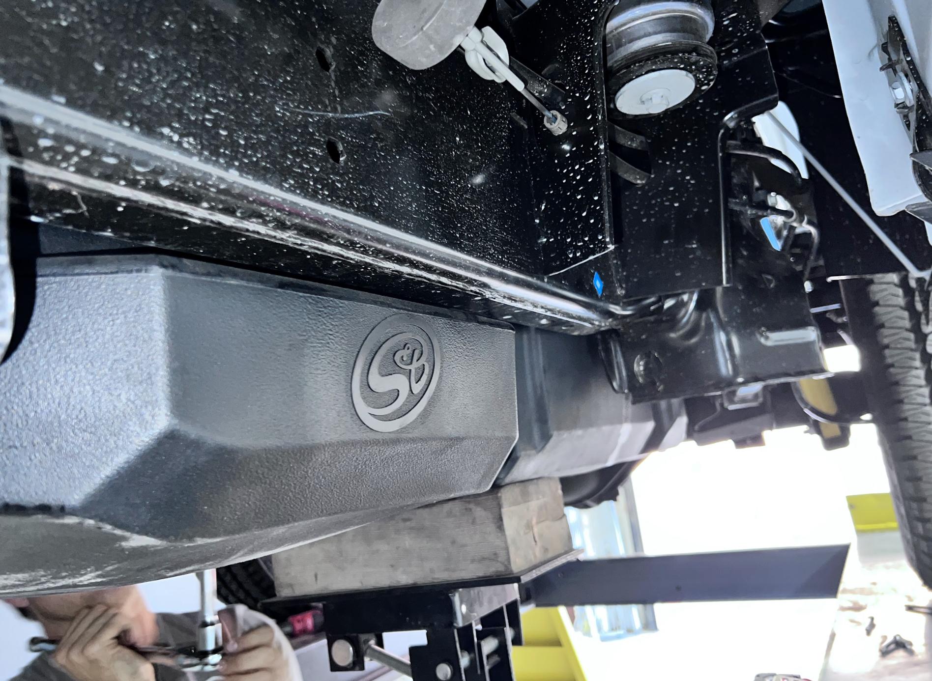 Install the S&B Fuel Tank in the stock location. Once installed, place a Jack or Ratchet Straps to hold it up.