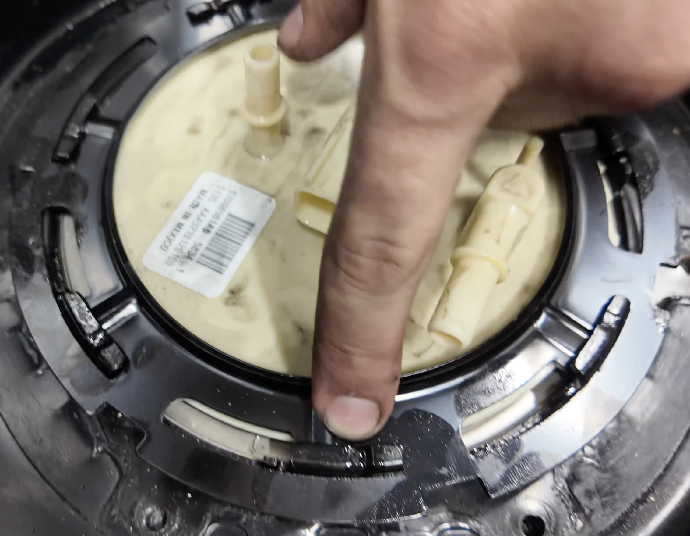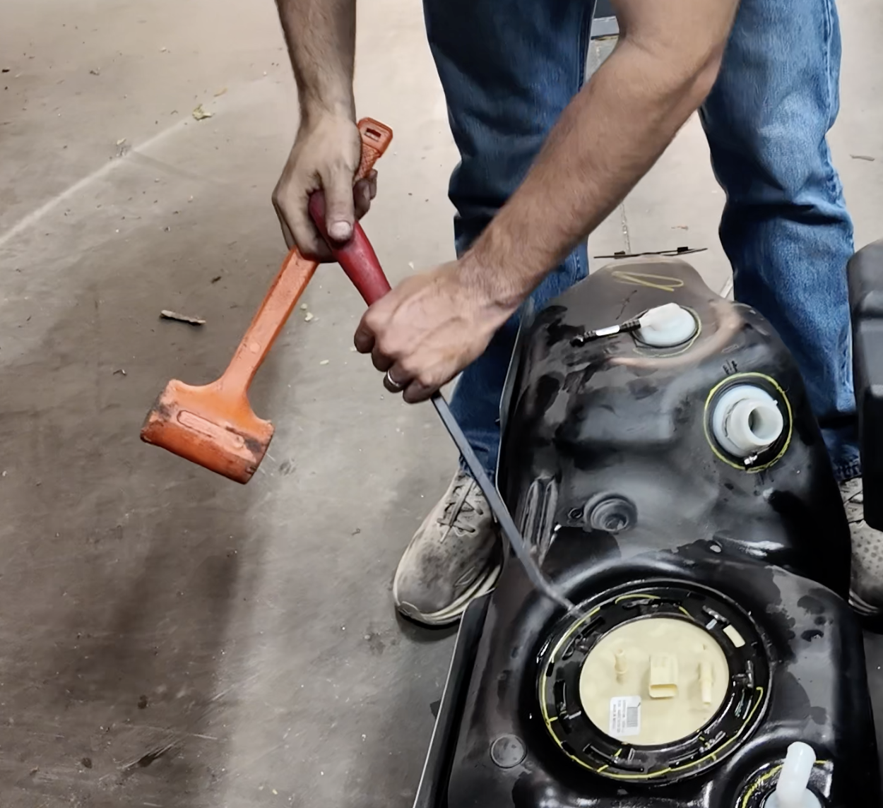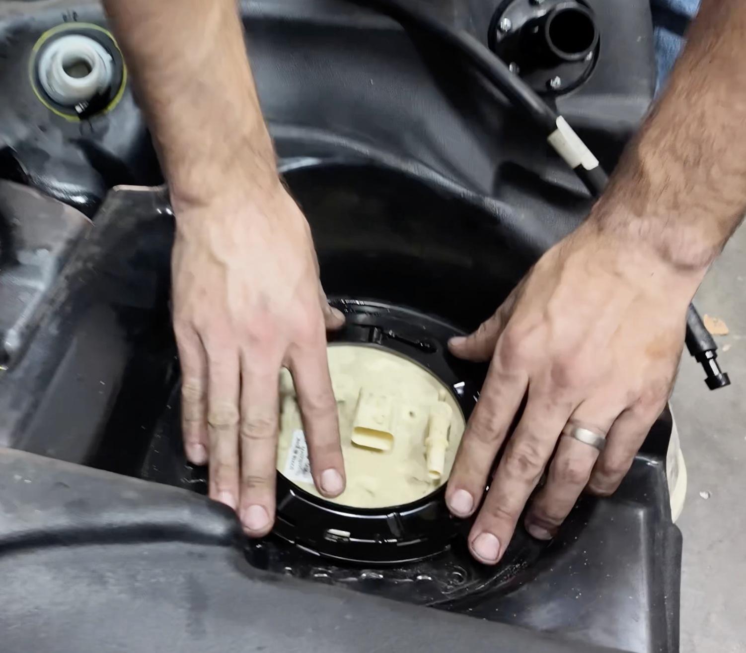 Prepare to transfer the OE Sending Unit to the S&B Fuel Tank by removing the OEM Locking Ring. We recommend using a Dead-blow and a small pry-bar.