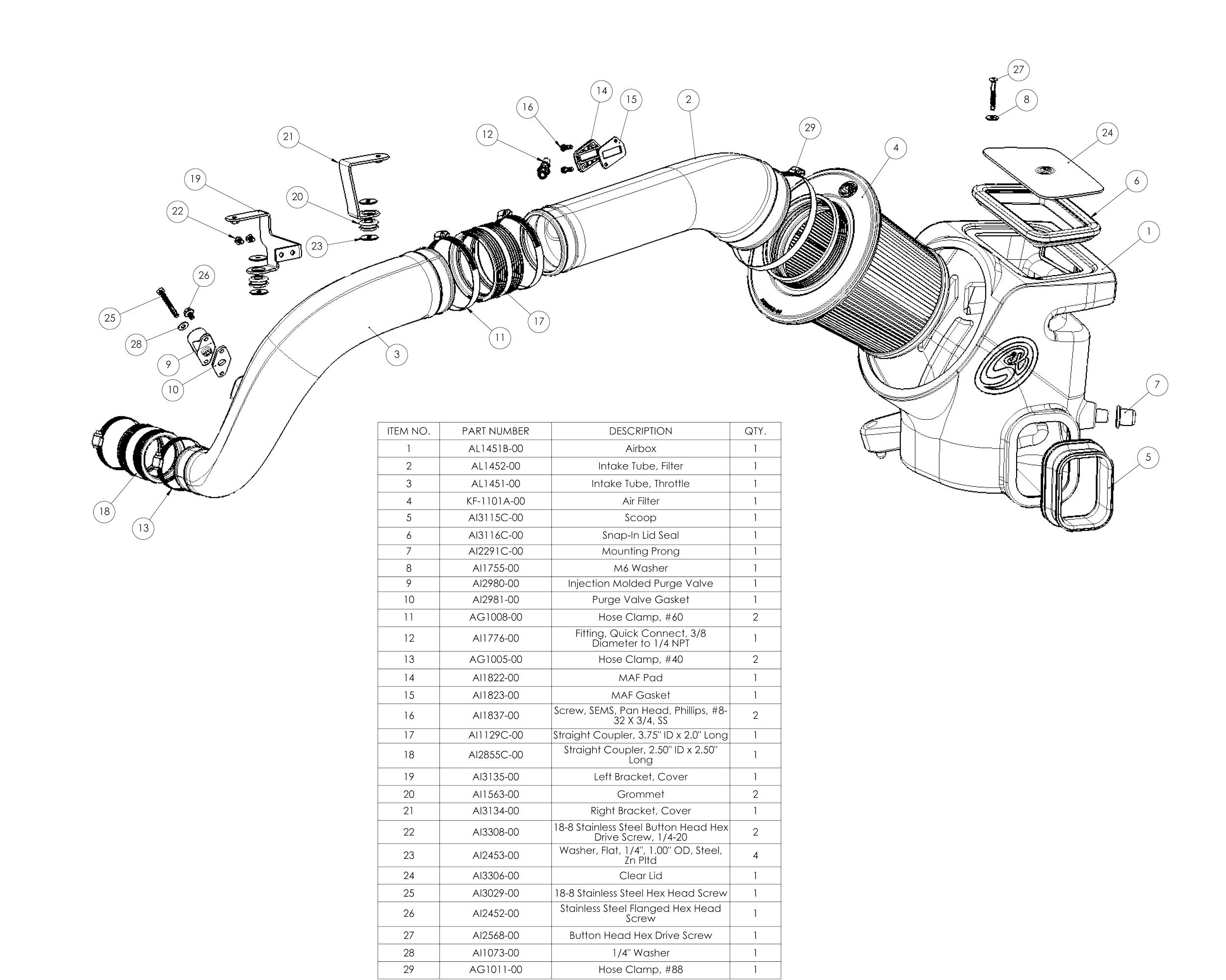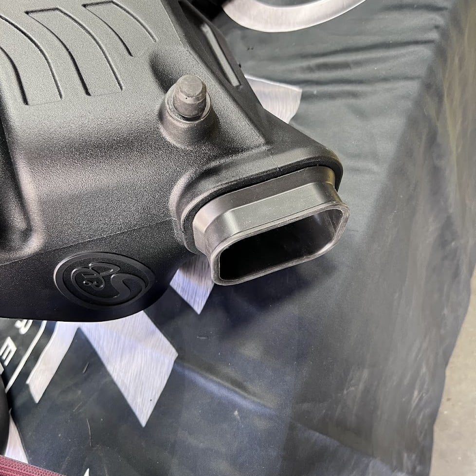 Install the airbox into the vehicle along with the filter, making sure that the rubber air inlet fits over the stock scoop. Be careful that the grommets do not fall off of the box.