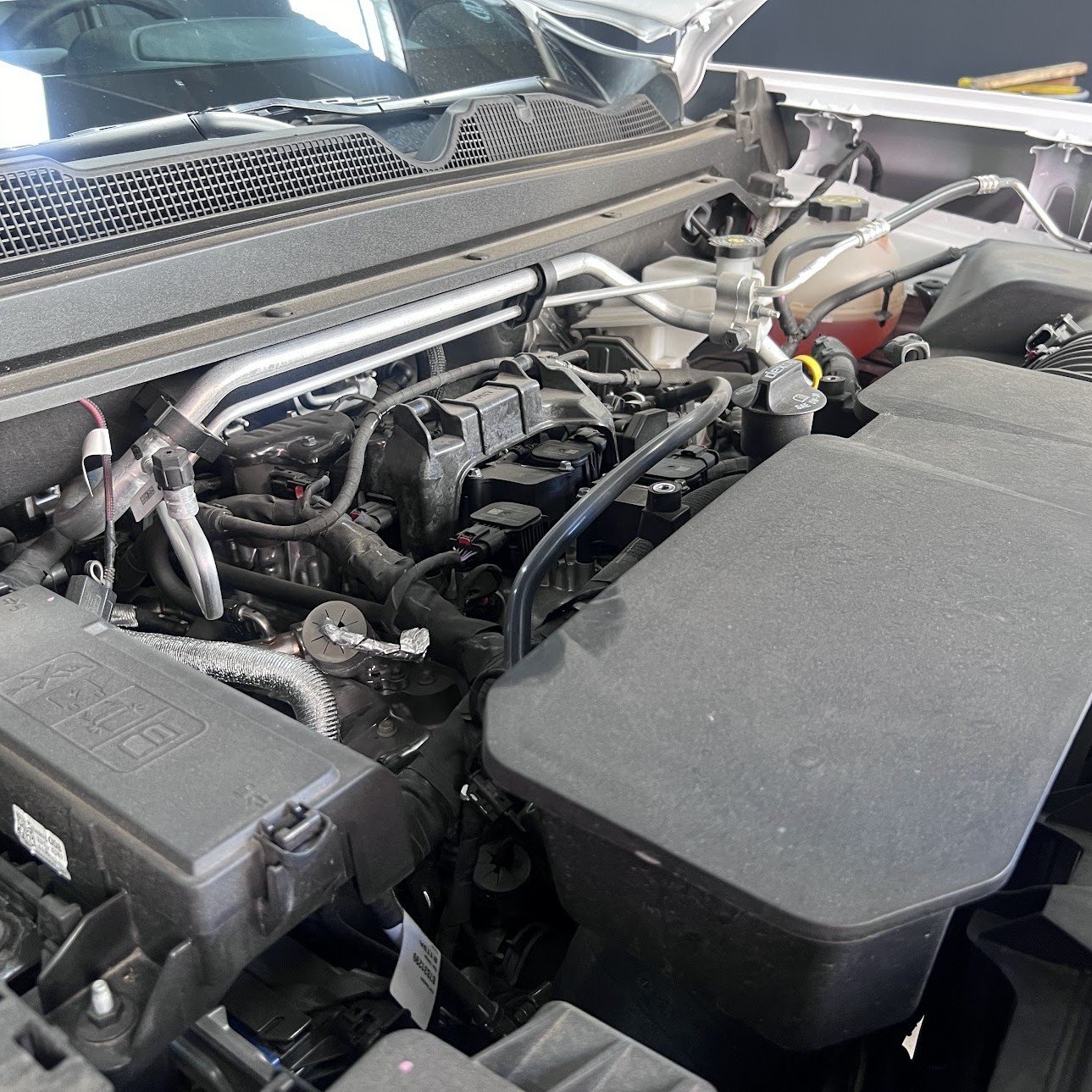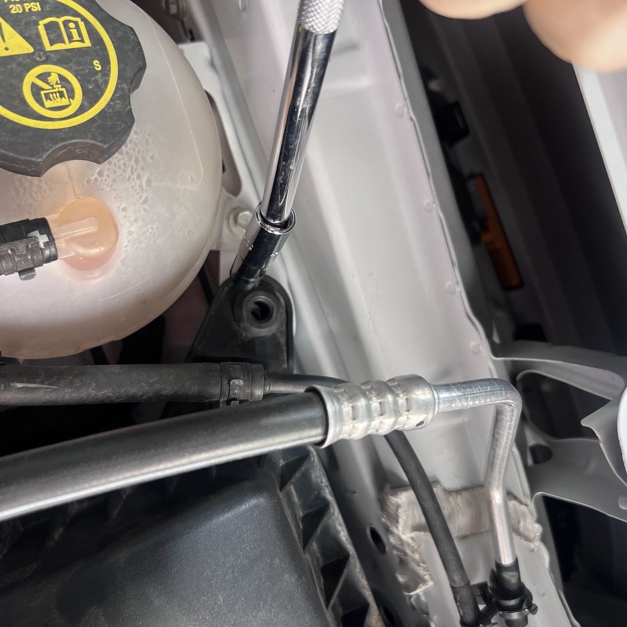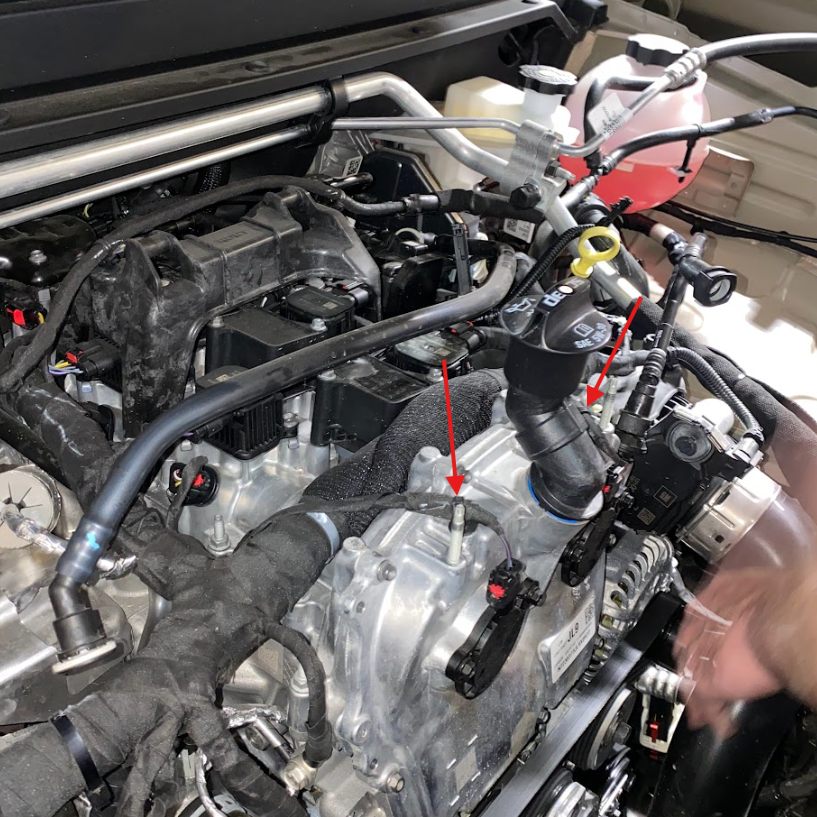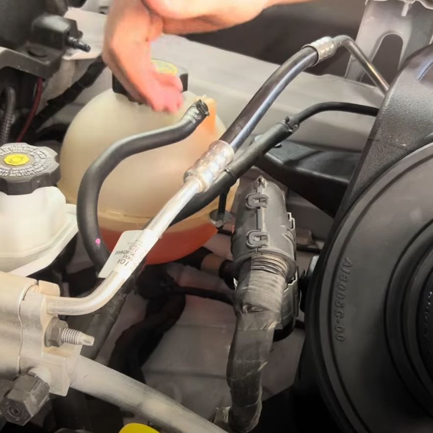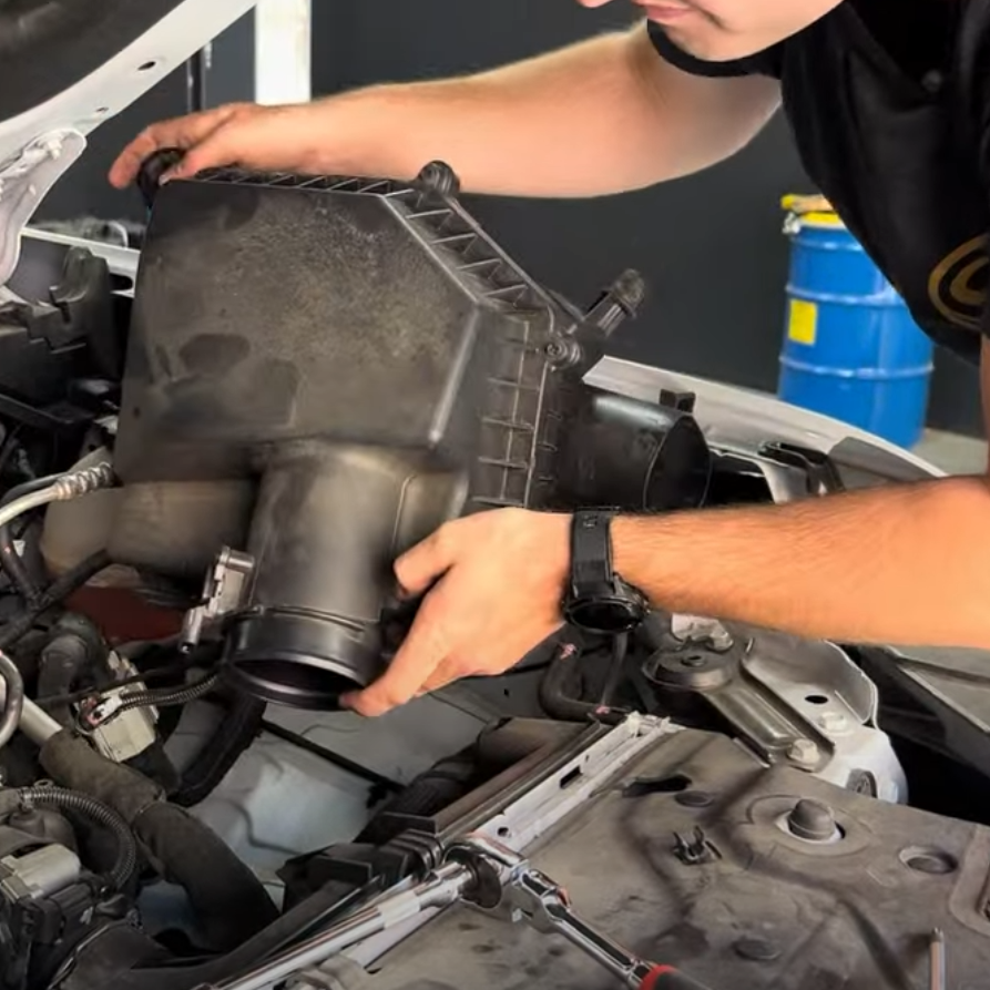 Remove the intake tube and airbox from the vehicle. The tube will need to go straight up at the engine area first to get it clear of the mounting studs. After the tube is removed, the airbox will need to maneuver out from underneath coolant lines to be pulled out.