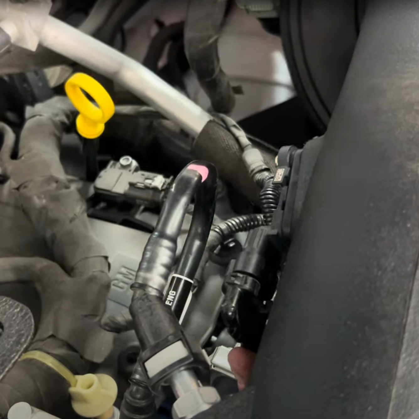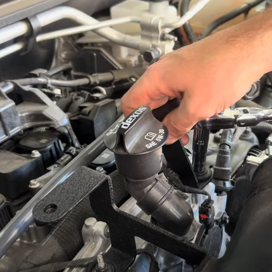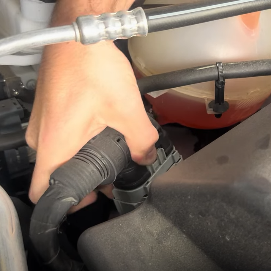 Disconnect the PCV fitting from the intake by pressing on the buttons on the side and pulling it off.