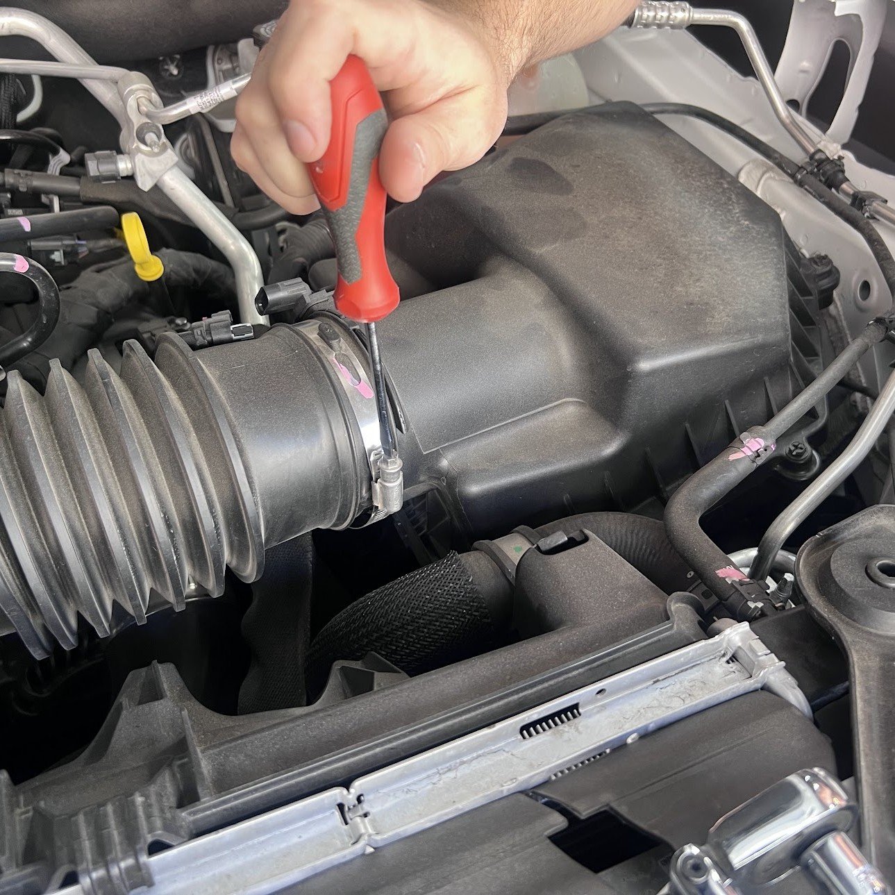Unfasten the hose clamp securing the OE intake tube to the throttle body using a long flathead screwdriver or a 7mm socket with an extension.