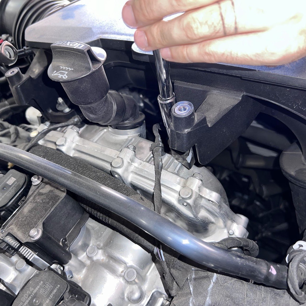 To begin removing the OE airbox, remove the screw fastening the rear of the intake box to the vehicle near the driver side fender.