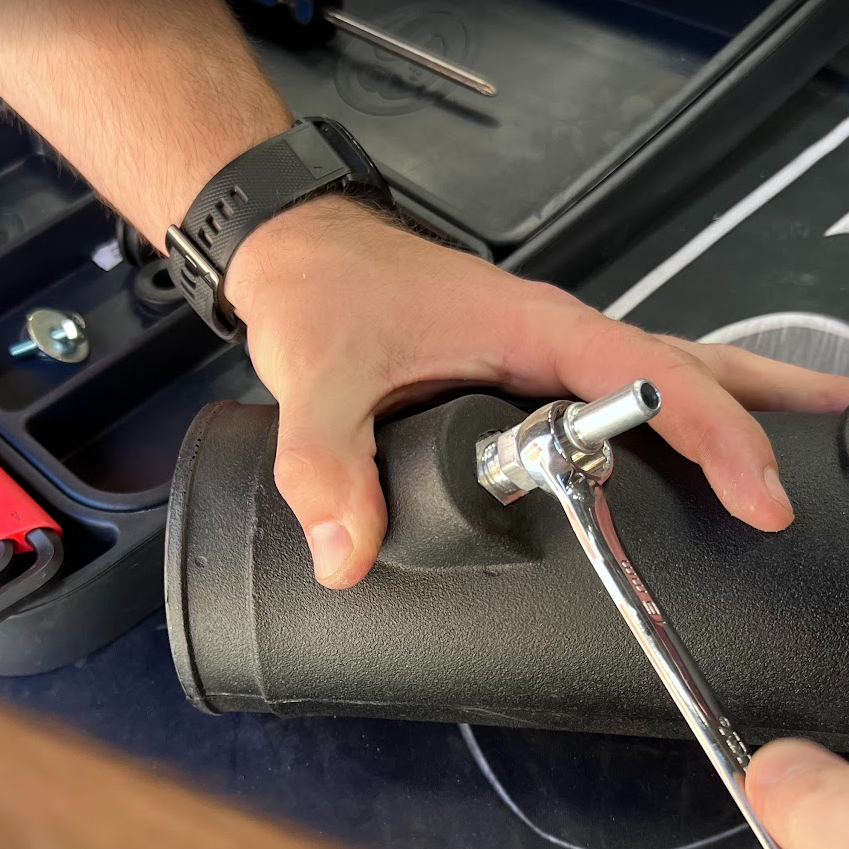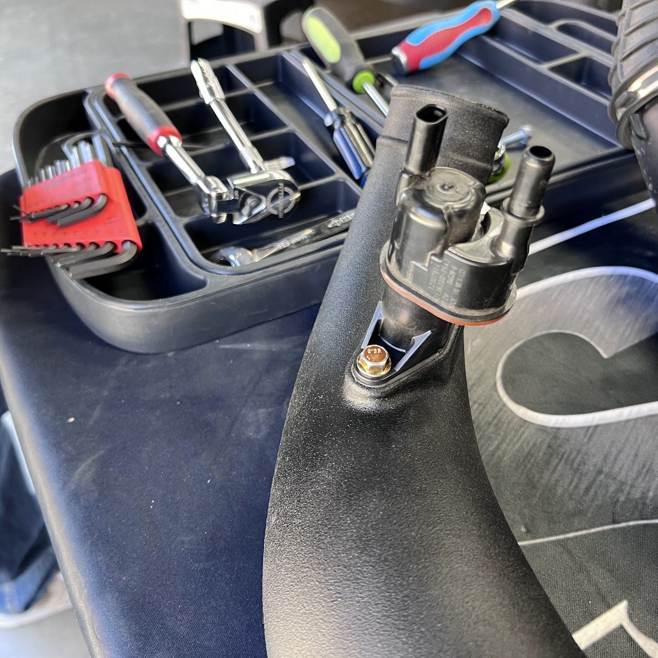 Prepare the curved intake tube by unfastening the purge valve from the stock intake tube, and then fastening it to the supplied adapter piece with the foam gasket sandwiched between the tube and the adapter using the supplied 2 screws as pictured. The intake will throw a check engine light if the foam is not installed between the adapter and tube.