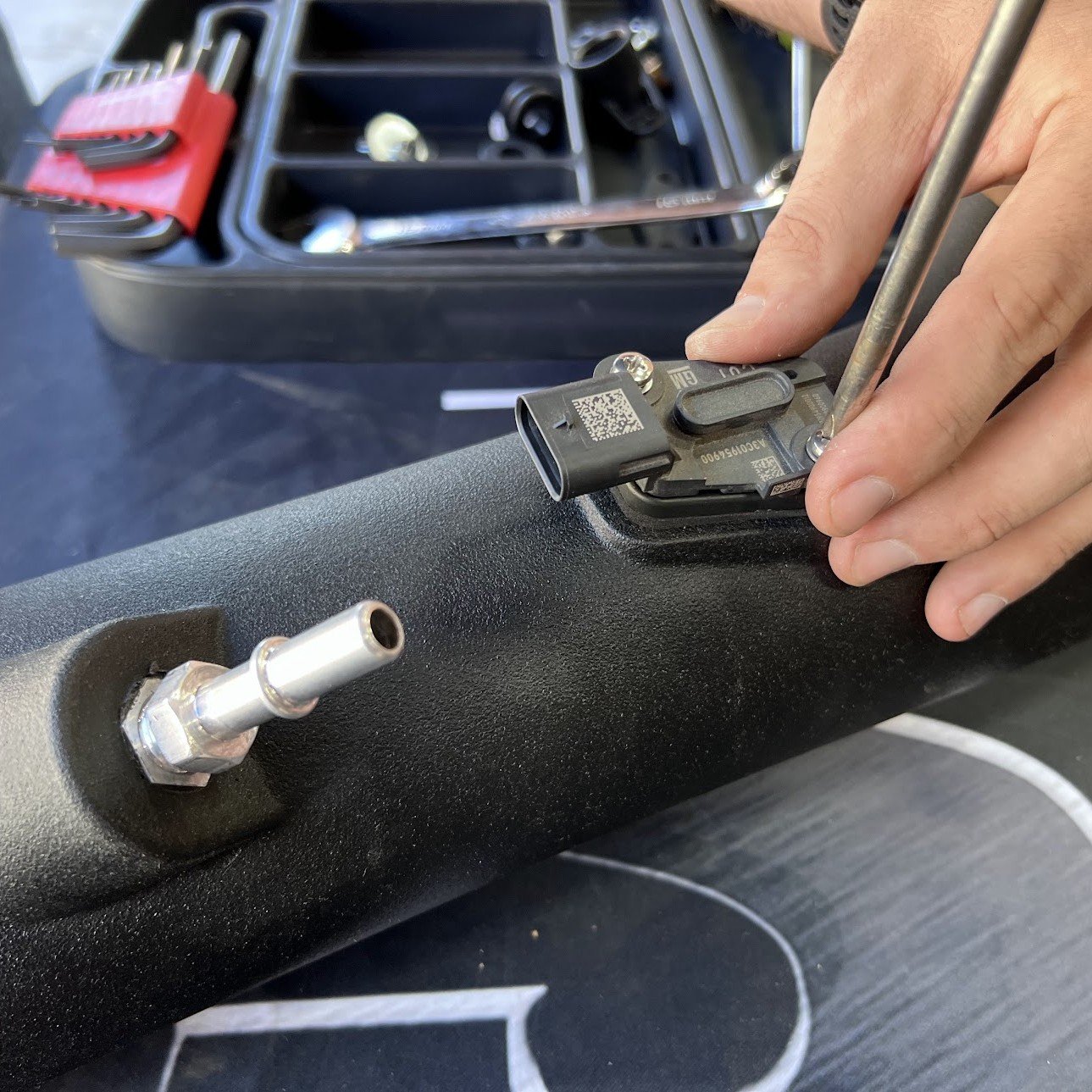 Next, place the MAF on the supplied hard plastic adapter piece. Then, put the foam gasket in between the tube and adapter piece and secure it with the supplied screws as pictured. The intake will throw a check engine light if the foam is not stalled correctly.