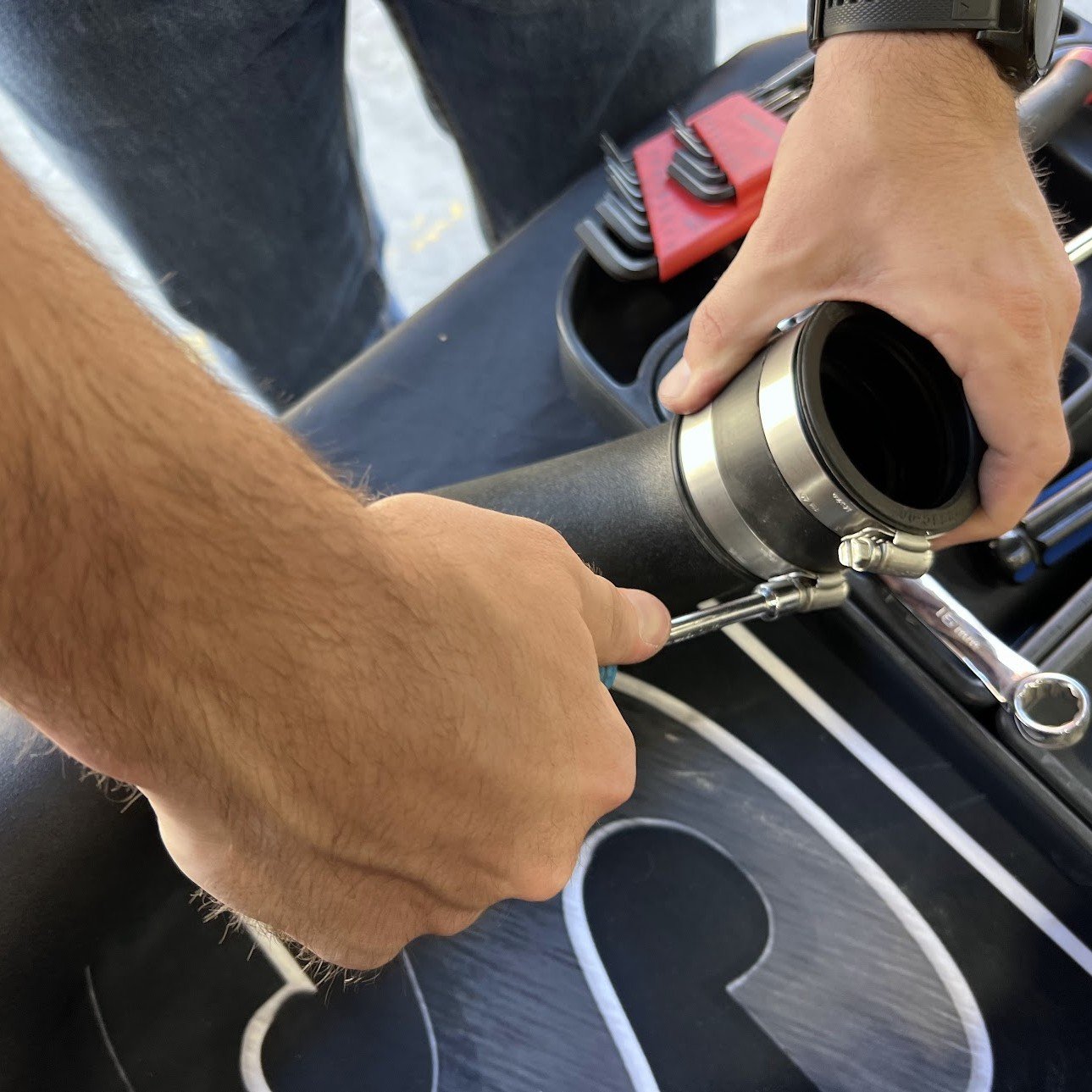 Add the smaller coupler to the curved intake tube and fasten the hose clamp to the tube. Put the next hose clamp loosely on the coupler to allow it to fit over the throttle body.