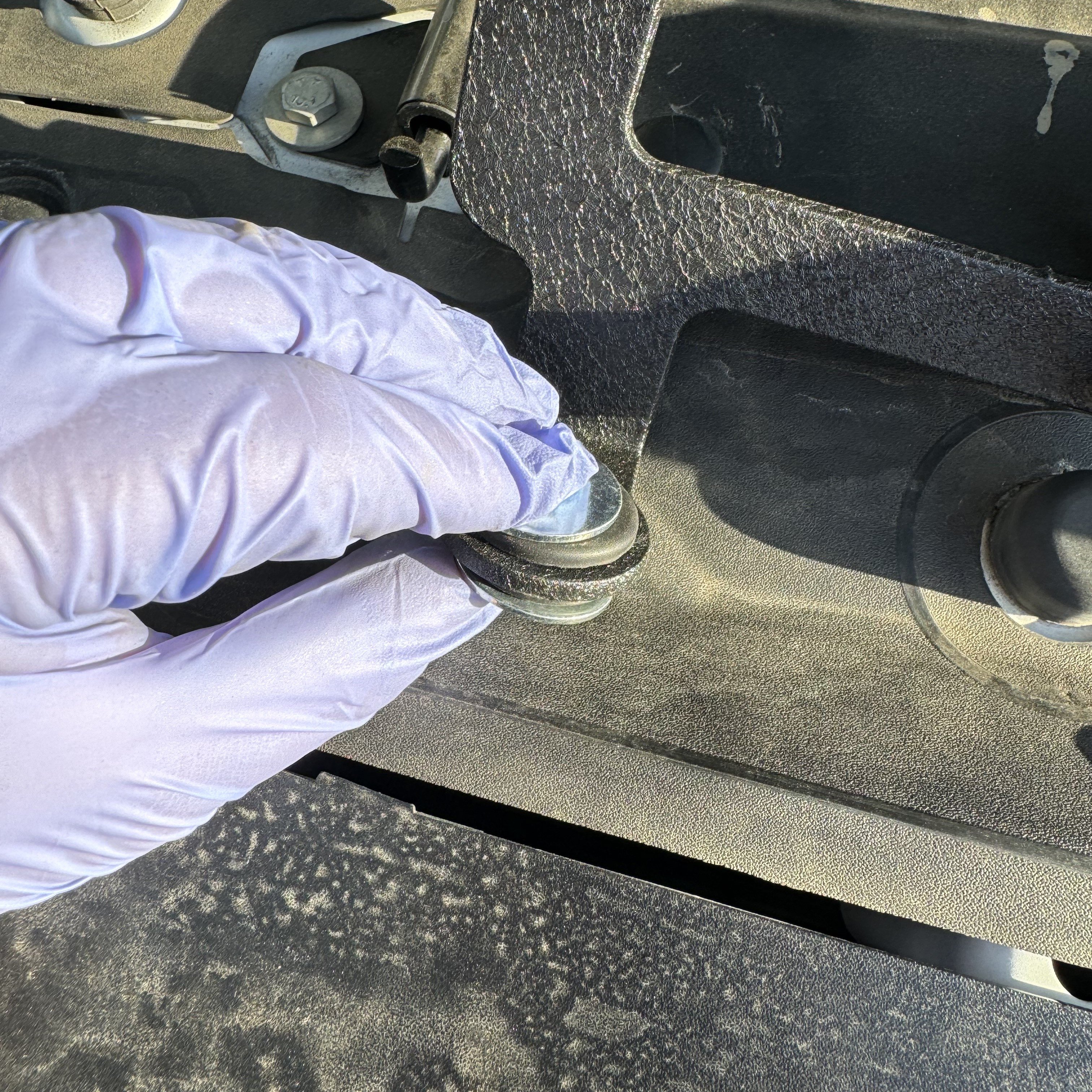 Prepare the supplied S&B mounting hardware by placing the grommets in the large hole and then sandwiching this grommet with the two large washers.