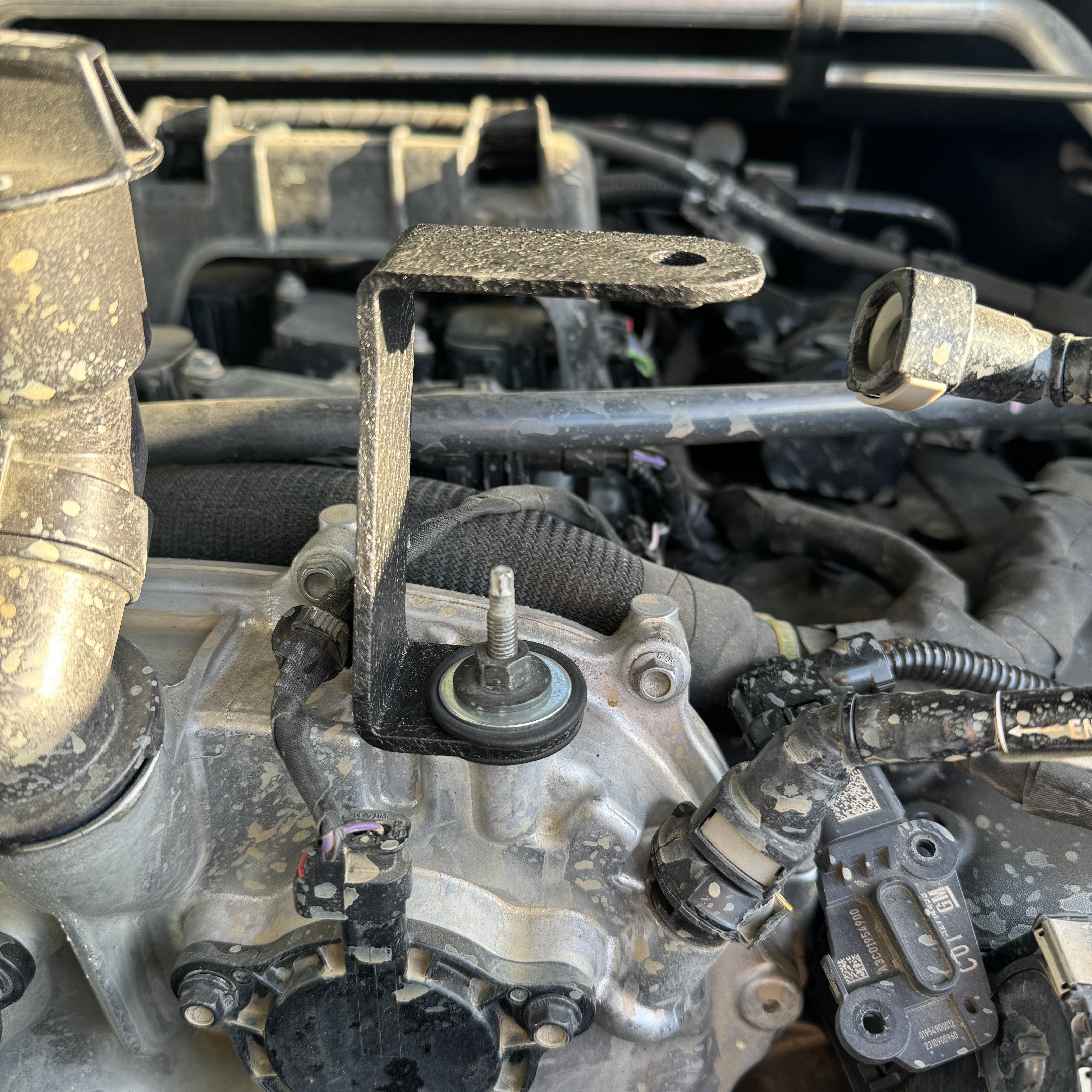 Install the other bracket on the passenger side engine mounting point, also fastening to the S&B tube. Fully tighten both brackets making sure the top tabs are pointing in an opposite direction towards the respective fenders of the vehicle. You can verify their orientation by making sure the holes line up with the cover. Make sure the harnesses are not being squeezed underneath the bracket.