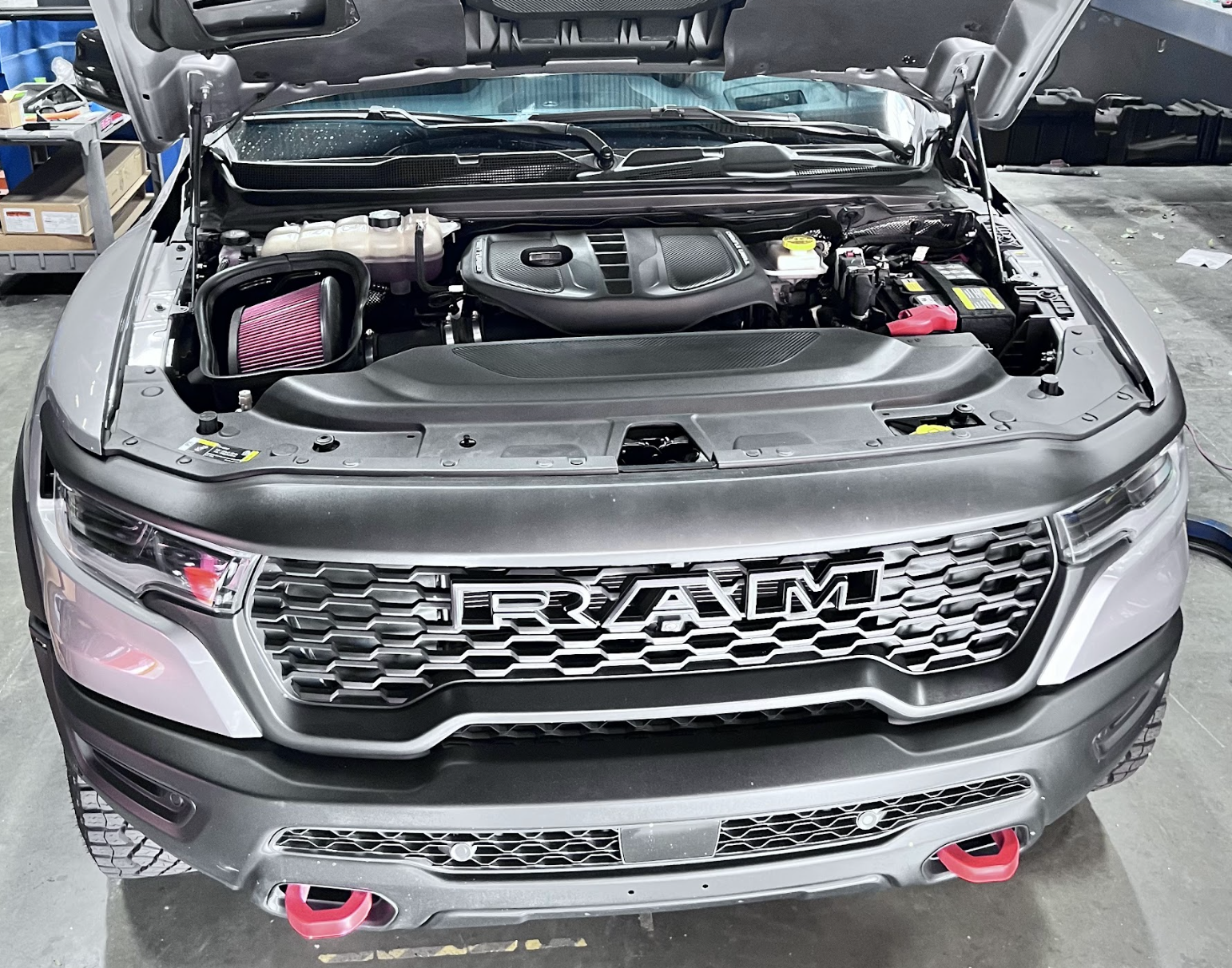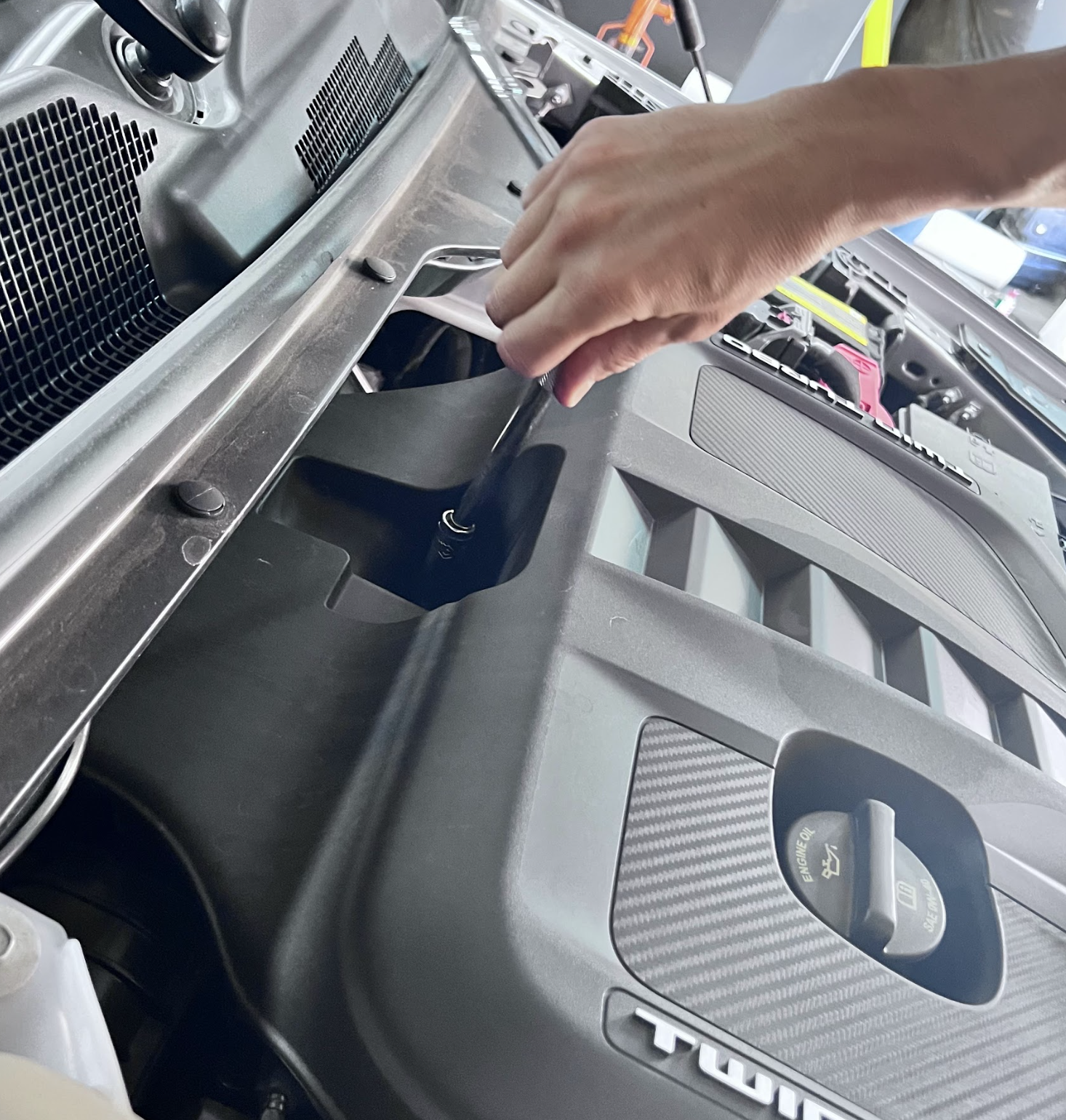 Re-install the factory engine cover back into position. Ensure that it's secured by fully mounting to the grommet posts and by tightening down the 13mm nut near the fire wall.