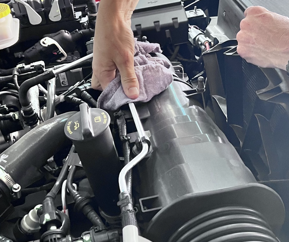 Disconnect the coolant reservoir line from the clips on the top of the stock intake tube.