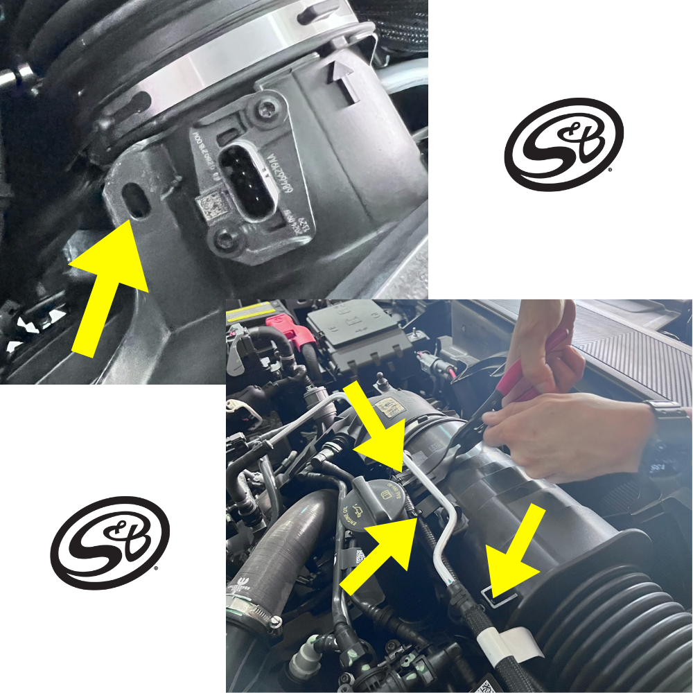 Install the coolant line and MAF electrical harness brackets onto the S&B intake tube.