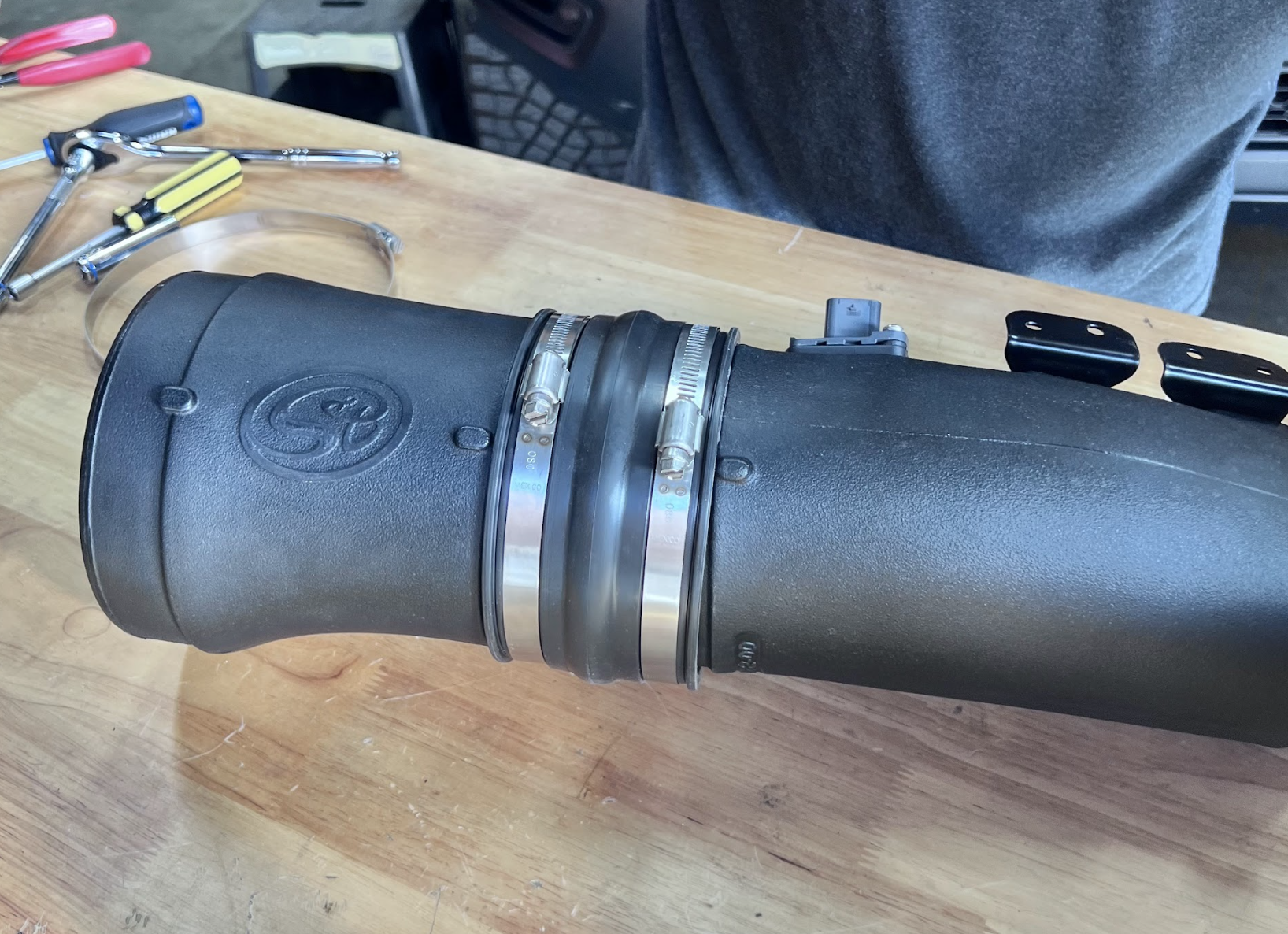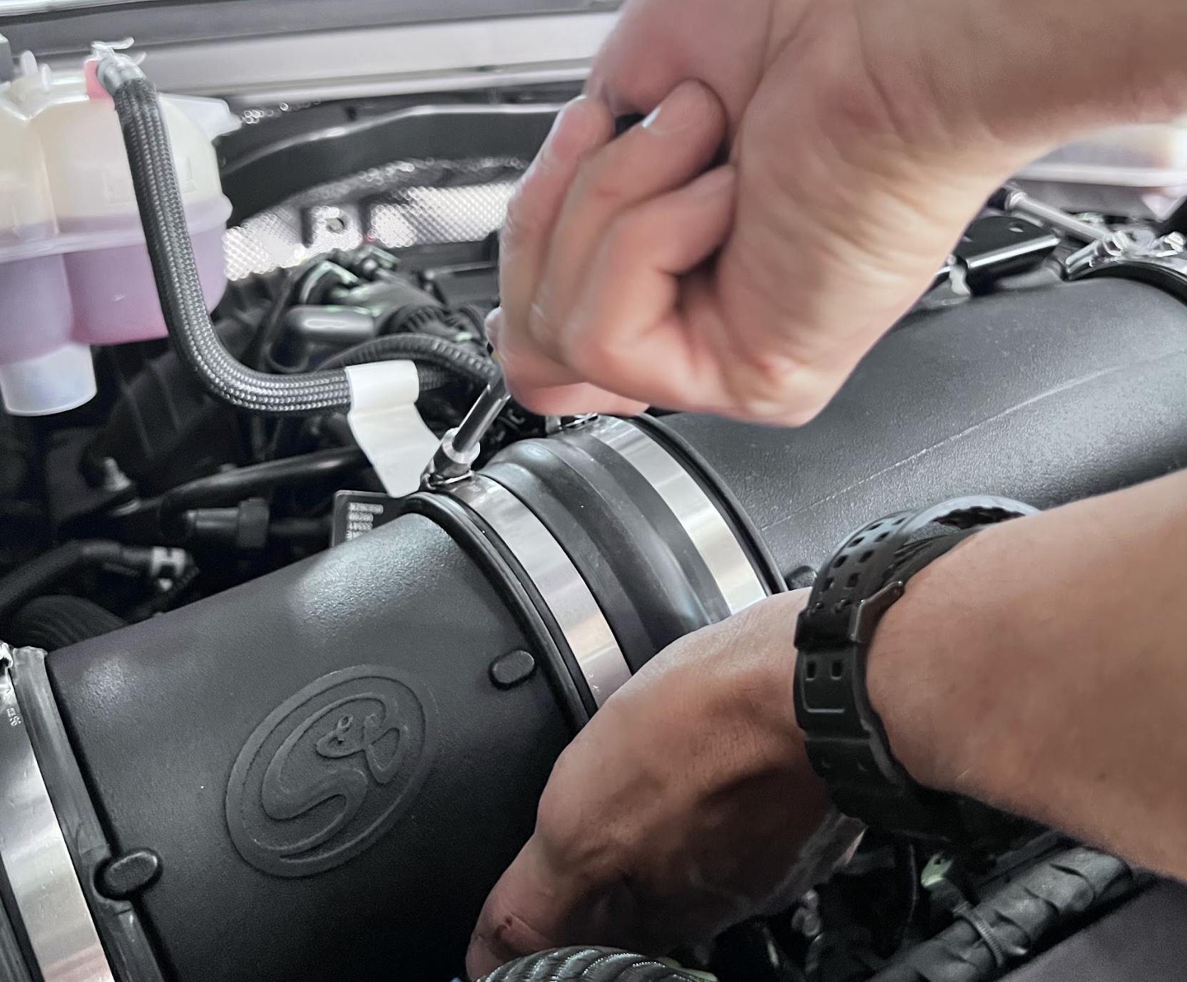 Once the S&B intake tube assembly is aligned, go ahead and tighten the (5) hose clamps using a 5/16th nut driver.